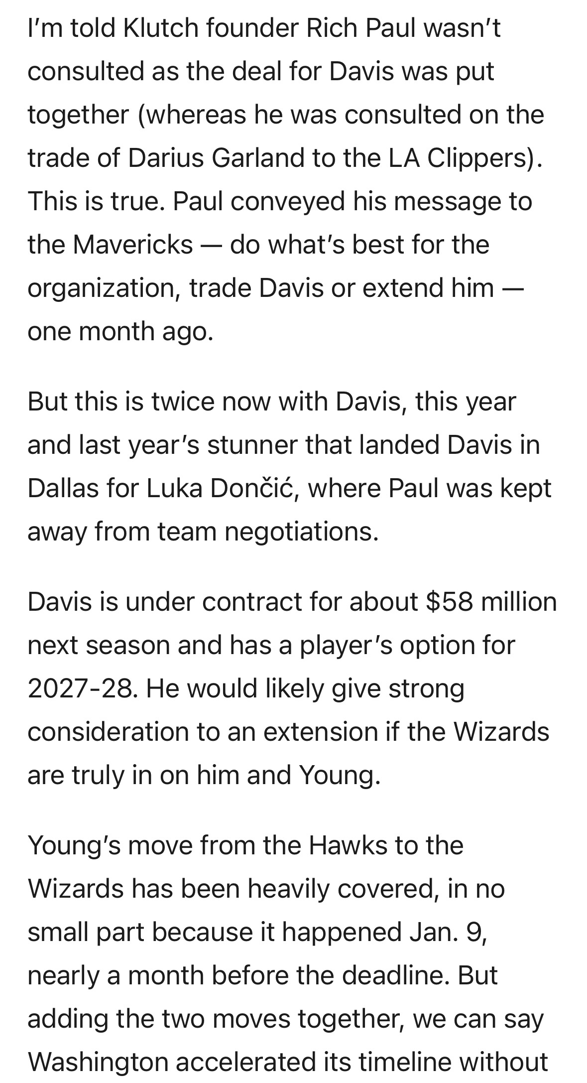 我被告知,戴维斯这笔交易敲定过程中,里奇-保罗并未被征询意见(而加兰被交易至快船时,他是参与了的)。这是事实。一个月前,里奇-保罗就向独行侠传达过态度——做对球队最有利的事,要么交易戴维斯,要么续约他。