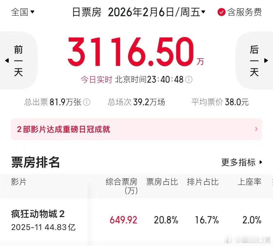 《疯狂动物城2》目前票房44.83亿,这周六日应该就能破45亿了吧。目前预测票房45.56亿。按这个标准算的话,最终票房应该能超过《满江红》。问题是《疯狂动物城2》的上限能达到多少。45亿甚至更多有没有戏?!