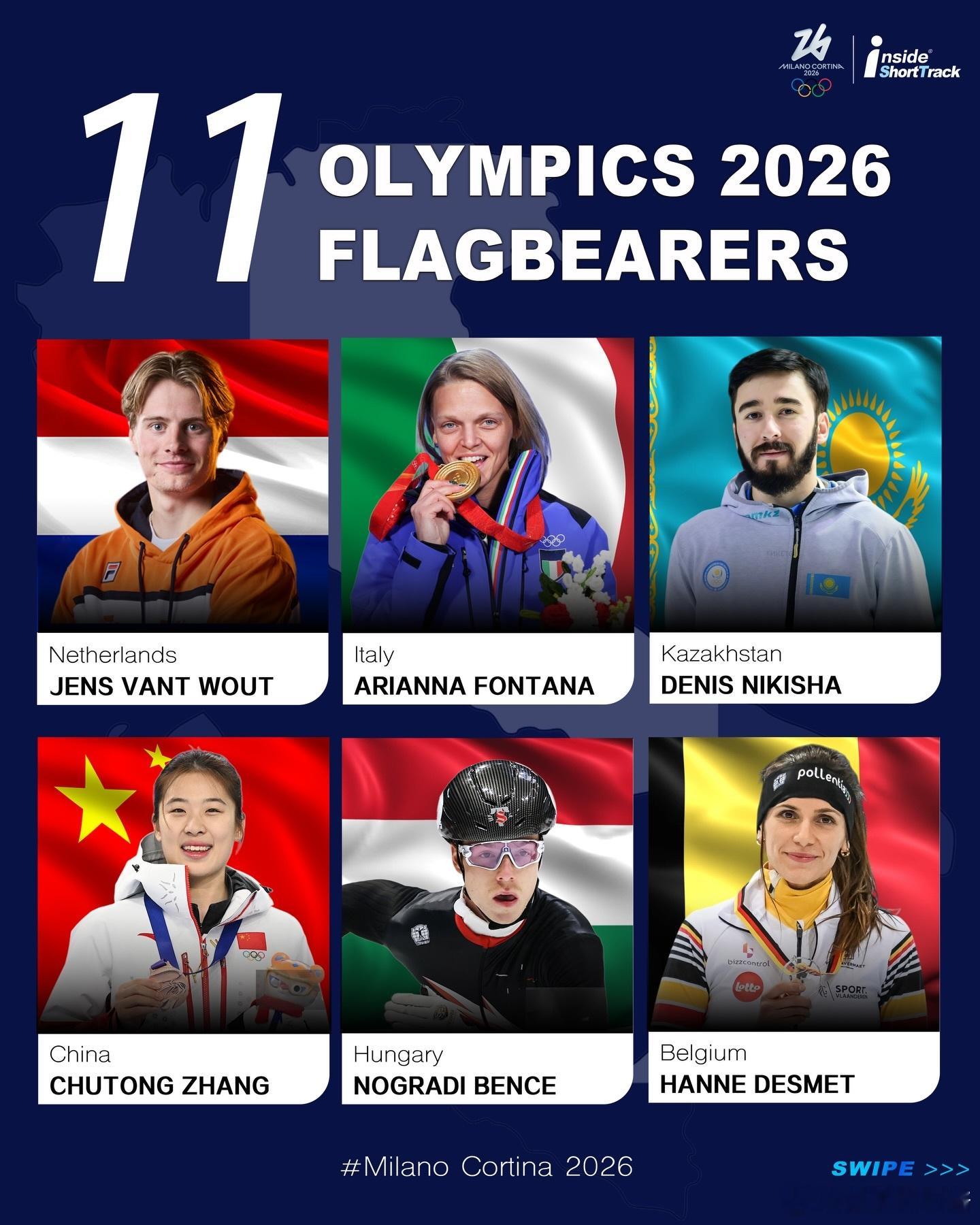根据各代表团公布的开幕式旗手,共有11位短道速滑运动员获此殊荣,其中就包括中国代表团旗手张楚桐、意大利代表团旗手方塔纳上咪咕看米兰冬奥开幕式米兰冬奥会开幕式