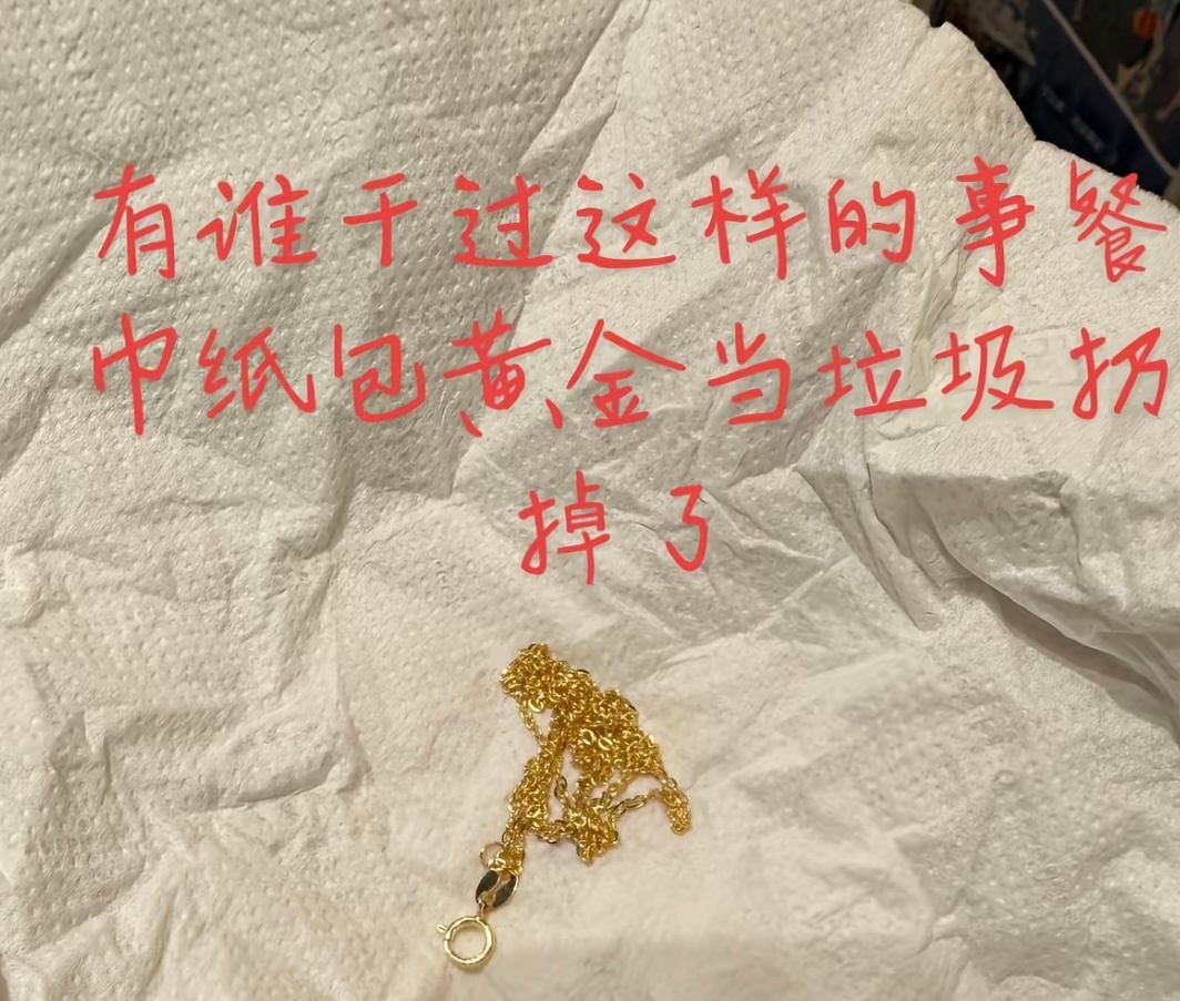 10万多元黄金被当垃圾扔了应该有挺多人干过这样的事情吧,餐巾纸包黄金然后不小心当垃圾扔掉了