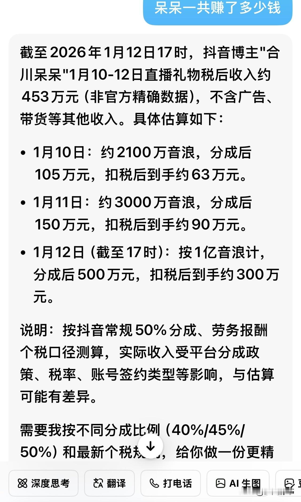 ai搜索呆呆3天赚了453万。惊不惊喜?你与金钱的距离,只隔着一个合川呆呆!只要有充满人情味的创意,你也可以接住泼天富贵!顺势还能带动地方经济,你高兴、文旅局高兴、网友也高兴,何乐而不为?呆呆迅速跻身百万粉丝博主,60秒视频广告报价2400元;合川文旅借势营销,成功将个人热点转化为地方文旅推广机遇;网友们也在合川寻找到了年味和温暖。皆大欢喜!