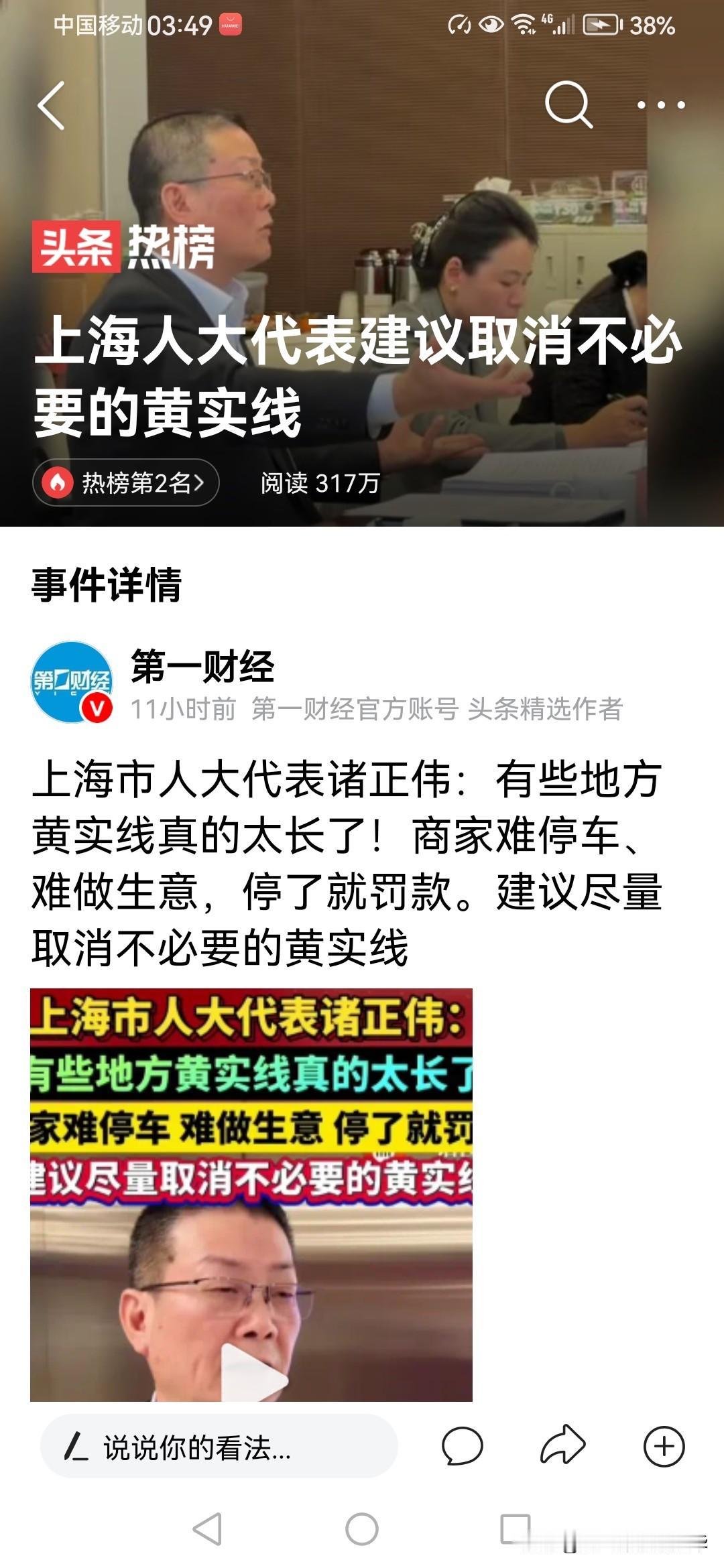 上海的人大代表,这次可是替老百姓说话了,他建议取消不必要的黄实线罚款,敢对交通规定扳手腕,为他这份正义感爆棚,举手表决支持一下。