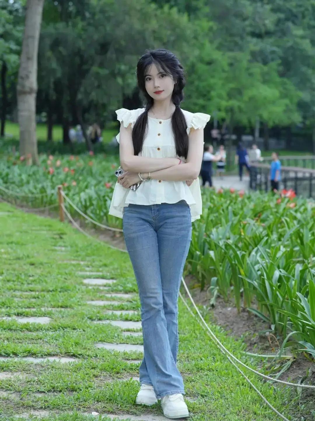 人物姿态优雅,一手轻抬靠近脸颊。身着白色拉链款修身上衣、浅蓝色喇叭牛仔裤,搭配高