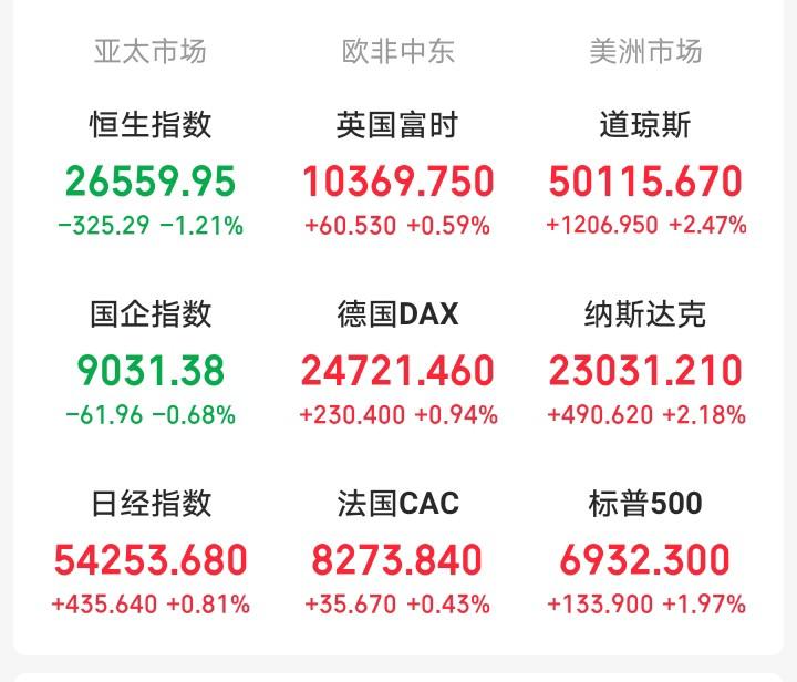 昨天晚上还想着大A跌的这么惨,下周大A还会反人性下跌! 一觉醒来,眼前一亮。隔夜,外围涨声一片,富时中国三倍做多ETF大涨,纳斯达克中国金龙指数收涨,富时A50期指连续指数收涨,老美三大指数集体反弹,贵金属暴力拉升,现货黄金再次大涨,现货白银暴涨。形势大好!给大A今下周走势奠定了良好基础。大A下周又要王者归来了?红包行情稳了? 隔夜,亚太市场普跌、欧非中东、美洲市场全面普涨,全球市场,涨多跌少,氛围良好。 隔夜,道指收涨2.47%,纳指收涨2.18%,标普500收涨1.97%,富时中国三倍做多ETF大涨7.73%,富时中国三倍做空ETF大跌7.89%,富时A50期指连续指数收涨1.03%,纳斯达克中国金龙指数上涨3.71%,外盘一片红! 广受关注的贵金属黄金白银也是暴力拉升,截至发稿,国际现货白银日内涨幅达到15.58%,收77.602美元/盎司,日内大幅上涨。现货黄金日收涨5.53%,站上4962.65美元/盎司。红彤彤的看着,真是好啊! 这形式也太好了!预计下周A股表现也不会太差,大家可以安心过周末了。 昨天看现货黄金白银暴跌,还以这次彻底没戏了呢!万万没想到,今天就又涨了。最近贵金属波动真是太大了,不是暴涨,就是暴跌,心理承受能力差的,根本受不了啊! 隔夜消息面: 消息一:国常会,深入谋划实施一批重大举措、重大项目,特别是要在发展新质生产力、做强国内大循环、促进居民增收等方面取得更大突破。 基础设施建设、消费领域、三农领域、民生保障领域等与民生福祉相关领域将会出台重大举措。 消息二:中国人民银行、国家发展改革委、工业和信息化部、公安部、市场监管总局、金融监管总局、中国证监会、国家外汇局印发《关于进一步防范和处置虚拟货币等相关风险的通知》。 此《通知》是对我国虚拟货币监管政策延续和升级,释放,对虚拟货币投机交易炒作,扰乱经济金融秩序,危害群众财产安全行为“零容忍”信号。加强跨部门协作和央地协同,完善监管要求,对虚拟货币、RWA相关违法犯罪活动保持高压态势。加大对挖矿行为整治力度,境内对虚拟货币坚持禁止性政策,虚拟货币相关业务活动属于非法金融活动,一律严格禁止、依法取缔。有助于防范金融风险向实体经济传导,保护投资者权益,维护国家金融安全和稳定。 消息三:国家卫生健康委今天发布《食品安全国家标准 预制菜》(征求意见稿)(以下简称“标准”),面向社会公开征求意见。其中明确指出预制菜保质期不得超过12个月,不得使用防腐剂,尽量减少添加剂的使用。重点从食品安全和营养健康方面对预制菜产品做出规定:对预制菜的原料、生产加工、产品包装、贮存运输、经营销售等全链条、各环节可能存在的风险因素和风险环节均提出管控措施。 民以食为天,食品安全是重中之重,自从预制菜出现以后,据报道,很多饭店的菜,都是进的预制菜,出去吃饭,不定那盘菜就是预制菜。现在有了国家标准,大家吃起来,更安全,更放心。 总体来看,无论是外围氛围还是消息面都很好,那么下周一大A高开高走收阳线,一改颓势,已无悬念,大家可以安心过周末了! 人最重要的是,要保持积极良好的心态,积极乐观的过好每一天。心有光,脚下有路,你远比自己想象的更坚韧,追光的人,终会光芒万丈。 理财有风险,投资需谨慎。大家一定要保持谨慎,做好风险控制。 点赞,关注,是对我最大的支持!