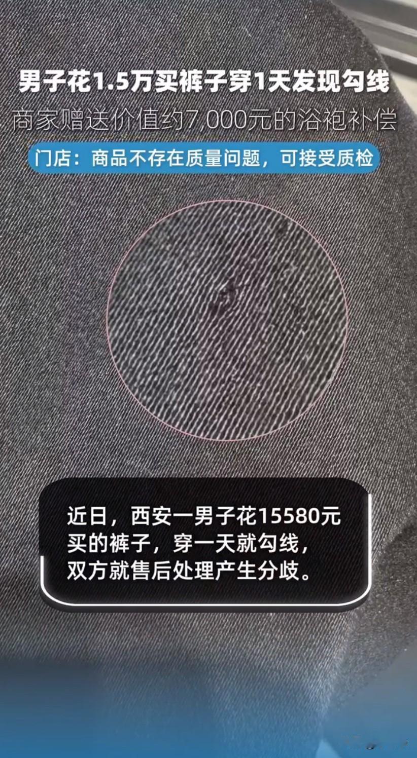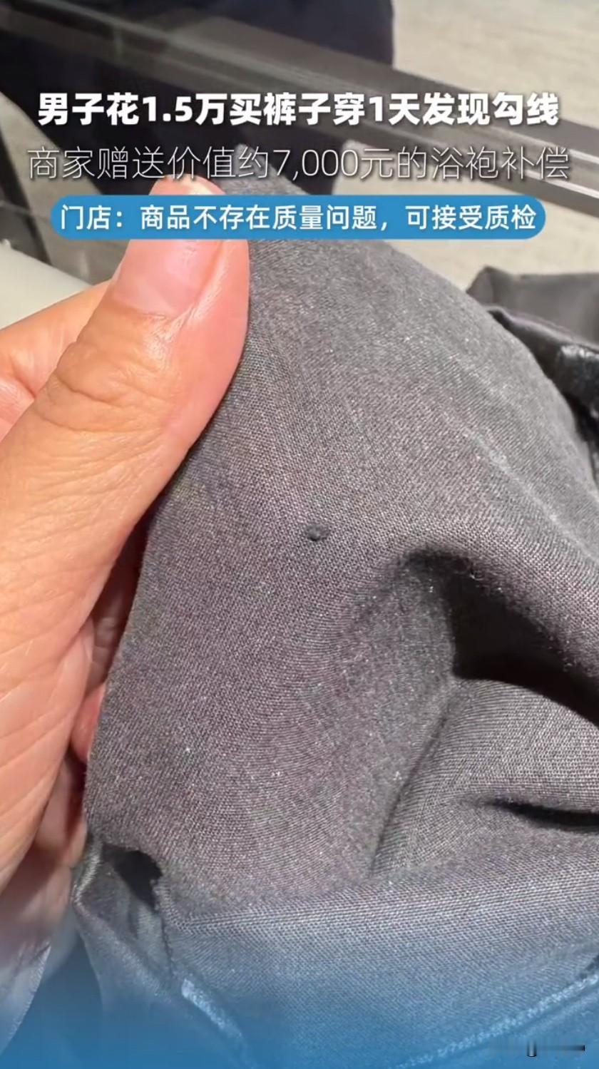 陕西西安的王先生遇上了糟心事,花15580元在SKP商场入手的奢侈品牌Kiton裤子,就正常穿了一天裤腿就出现勾线问题,找门店维权想换货退货却屡屡碰壁,门店以裤子做过裁边改衣影响二次销售为由拒绝退换,只愿意维修或送浴袍补偿,双方就售后问题各执一词,这事儿也让不少人直呼高价奢侈品的品控和售后太让人失望。王先生在商场看中了这款Kiton的裤子,花费15580元买下后,按自己的尺寸做了裁边改衣,等裤子改好送达后,他就在写字楼里正常办公活动,全程没有做过任何剧烈运动,也没接触过尖锐物品,结果只穿了一天,就发现裤腿位置有明显的勾线瑕疵,好好的奢侈品裤子才上身体验就出了问题,王先生心里别提多膈应了,第一时间就把问题反馈给了品牌门店。之后门店把裤子取回进行修补,可王先生看到修补后的裤子,觉得勾线的痕迹还是很明显,根本恢复不到全新的状态,一万多买的裤子刚穿就有瑕疵,任谁都接受不了,于是他向门店提出了换货的要求,要是没有合适的货可换,就希望门店能直接退货,王先生表示,自己全程都是正常穿着,没有任何拉扯、刮蹭的人为损坏行为,出现勾线问题,大概率是裤子本身的面料或做工有质量问题,理应由品牌方负责。可门店这边的回应,却和王先生的诉求大相径庭,门店称,这款裤子已经做了裁边的个性化改衣处理,属于定制化修改,会影响二次销售,按照规定根本不能办理退换货,对于王先生的不满,门店仅能出于安抚的角度,要么继续对裤子进行维修处理,要么赠送一件价值约7000元的品牌浴袍作为补偿,没有其他解决办法。不仅如此,品牌总部也对这件事给出了认定,称经检查该商品不存在质量问题,还表示可以接受第三方专业机构的质检,用检测结果来说话。目前王先生并没有接受门店的补偿方案,依旧坚持自己的换货或退货诉求,双方的协商还在僵持中,一方觉得高价购买的奢侈品刚穿就出问题,品牌方理应妥善解决,另一方则以改衣影响销售为由拒绝退换,只愿做补偿处理,这场因大牌裤子勾线引发的维权纠纷,也让大家关注到奢侈品售后的相关问题。