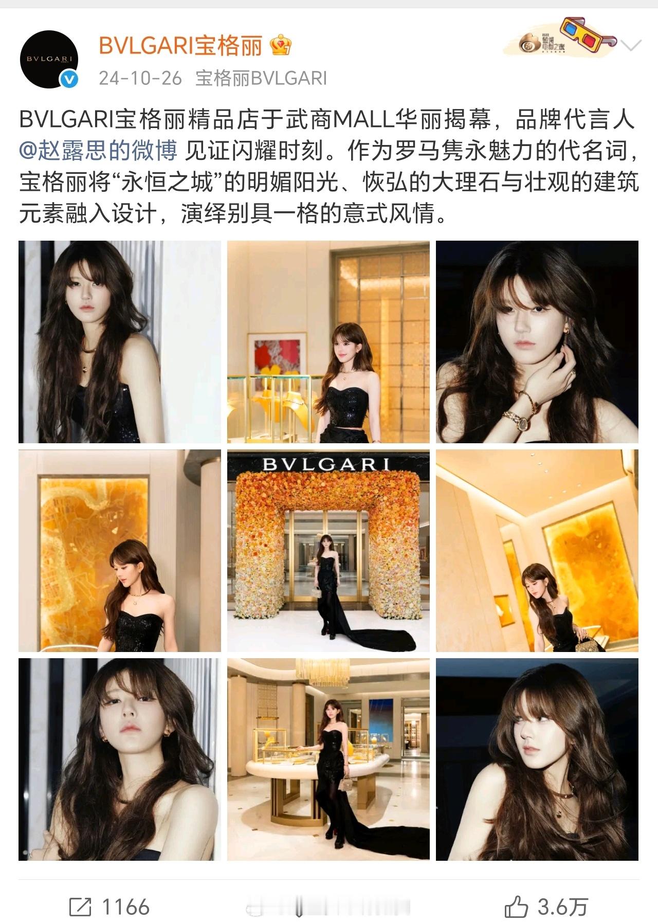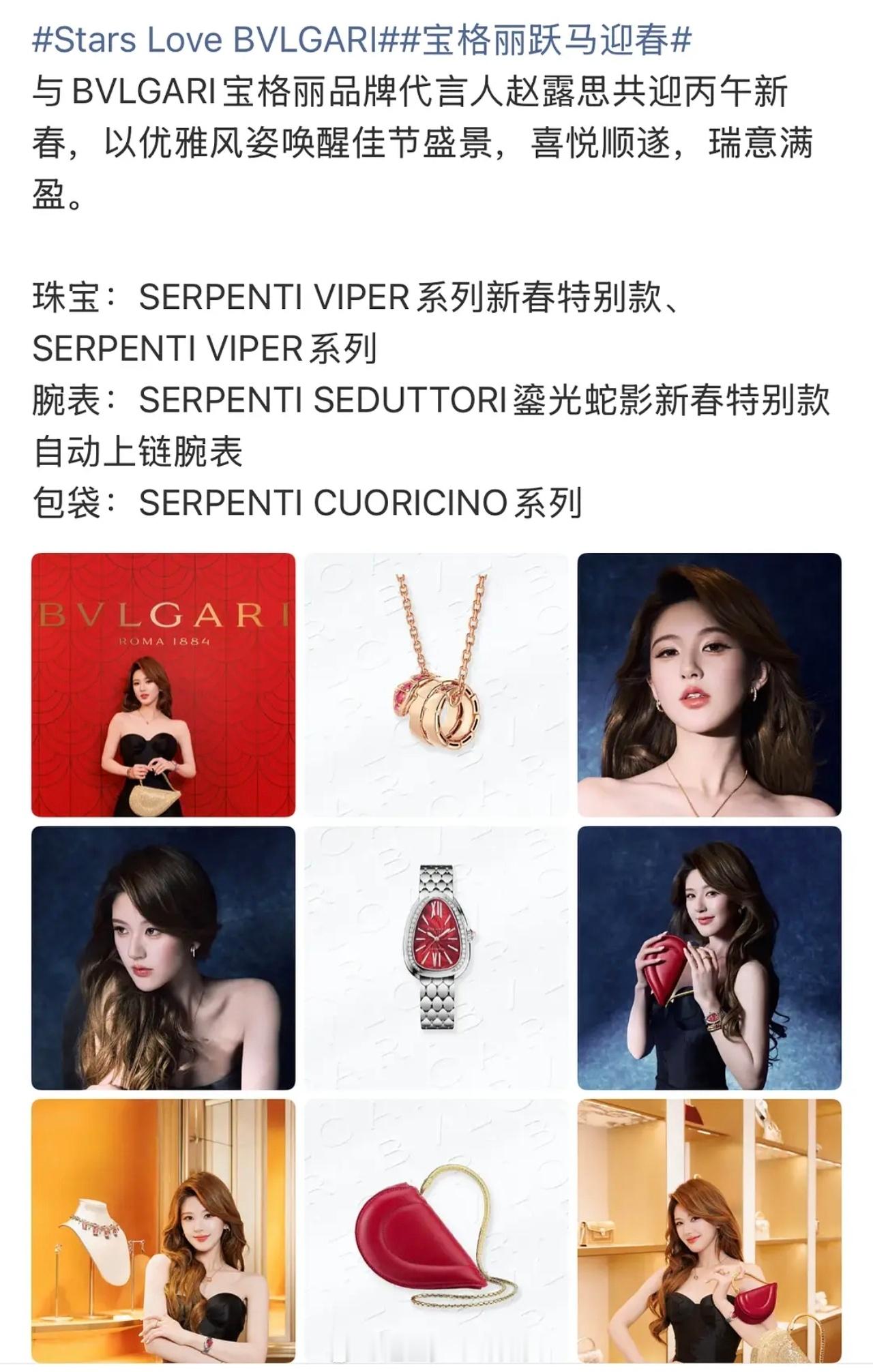 宝格丽终于在官微上分领了赵露思的代言人身份!上一次认领代言人还是在 24 年 10 月,后面虽然有认领同款信息,但是都没有标注代言人三个字。因为这次新春大片没有拍,导致不少人开始怀疑是不是掉了,这次终于实锤了!还是代言人,没有掉!!