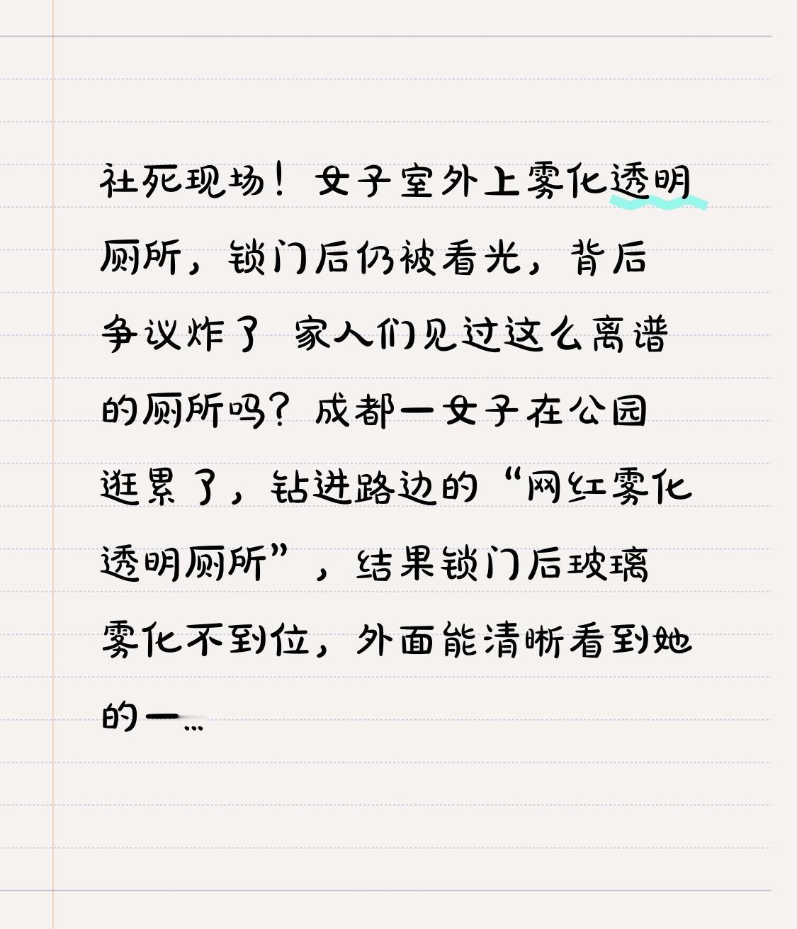 社死现场!女子室外上雾化透明厕所,锁门后仍被看光,背后争议炸了 家人们见过这么离谱的厕所吗?成都一女子在公园逛累了,钻进路边的“网红雾化透明厕所”,结果锁门后玻璃雾化不到位,外面能清晰看到她的一举一动,朋友拍的视频发到网上,直接让网友笑到劈叉又气到发抖! 这厕所可不是普通公厕,通体是玻璃墙,摆在公园路边,背后就是小河,面前全是来往行人,主打一个“科技感”——无人使用时是全透明,号称能防坏人藏匿;人一进去锁门,玻璃就自动雾化,保护隐私。女子本来是想体验下新鲜,结果刚关上门,尴尬事就来了:雾化后的玻璃看着雾蒙蒙的,可她穿的黑衣服太显眼,身形轮廓、抬手低头的动作,外面看得一清二楚,跟没遮挡差不多! 女子出厕所看到视频,脸都红到脖子根,网友们更是笑疯了,评论区魔改成语“静观其便”“一目了然”刷屏,还有人分享更离谱的经历:深圳有大哥在商场用这种厕所,刚脱裤子玻璃突然变透明,屁股都被路人看光;广州有人遇到系统故障,锁门后玻璃根本不雾化,硬生生在里面僵了十分钟不敢动! 本以为只是个别厕所的技术问题,没想到转折点来了——这种雾化厕所居然在全国多地蔓延!深圳不少商场还搞出“控烟版”,正常状态是雾化,一旦检测到烟雾,玻璃立刻变透明还报警,美其名曰“硬核控烟”。可问题接连爆发:有人只是对着镜子哈了口气,热气触发传感器,玻璃突然透明;武汉某商场的厕所,相邻隔间居然能互相看到,彻底沦为“社死现场”! 更让人揪心的是法律风险。律师明确说了,如厕是受《民法典》保护的隐私,就算是控烟,也不能用暴露隐私当惩罚手段。而且这些厕所的技术漏洞太多,断电、传感器误判、雾化不彻底,随便一个问题都能让普通人“社会性死亡”。可为啥还有人推广?商家说能提升卫生度,靠透明设计督促大家爱护环境;管理方说能防犯罪、控烟,可这些所谓的“好处”,都是建立在牺牲普通人隐私的基础上! 其实大家要的很简单:一个安全、私密、干净的厕所而已。成都早就有聪明做法,公厕升级不搞花里胡哨的透明设计,而是加第三卫生间、智能除臭、实时蹲位提示,既实用又贴心。反观这些雾化透明厕所,花了比普通厕所贵几倍的钱,却把最基本的隐私保障抛在脑后,到底是创新还是噱头? 公共设施的核心是服务人,不是折腾人。技术再先进,也不能越过隐私的底线;治理再用心,也不能以牺牲尊严为代价。一个真正有温度的城市,不会让市民上厕所还要提心吊胆,担心被人“围观”。 你遇到过这种奇葩厕所吗?觉得这种雾化透明厕所该推广吗?评论区聊聊你的看法,点赞转发,提醒身边人:遇到这种厕所慎入!也希望商家和管理方能醒醒:别再搞这些华而不实的设计,把钱花在刀刃上,让公厕回归“方便、私密”的本质,才是真的为民服务!