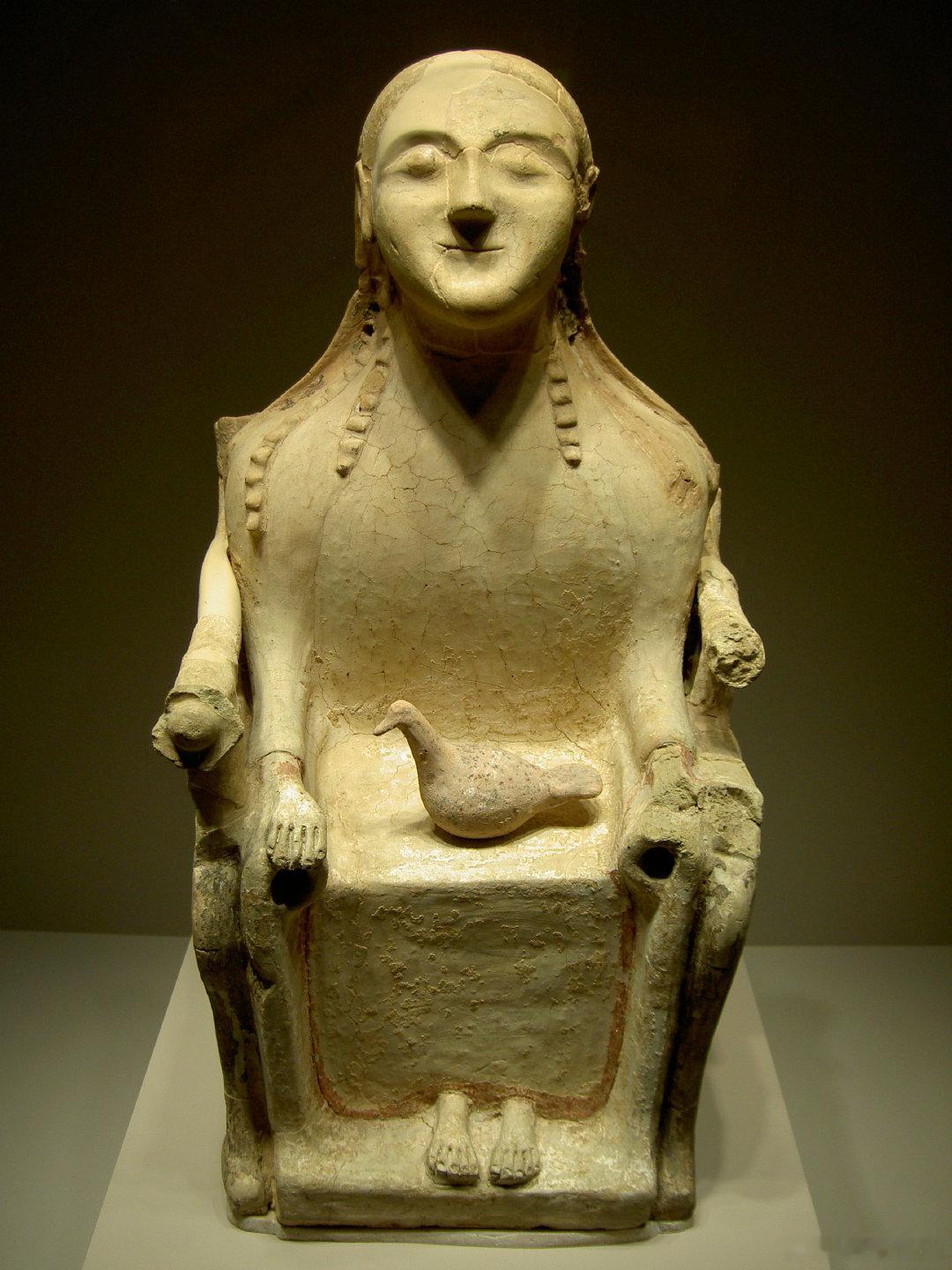 西洋历史文化鱼缸 历史知识 意大利米兰考古博物馆收藏的一尊公元前6世纪陶土神像,一般认为是古希腊的大地与丰收之神得墨忒耳。雕像出土于西西里岛,注意其头部和耳朵有孔洞,说明当年曾经佩戴饰品,但已经遗失了。