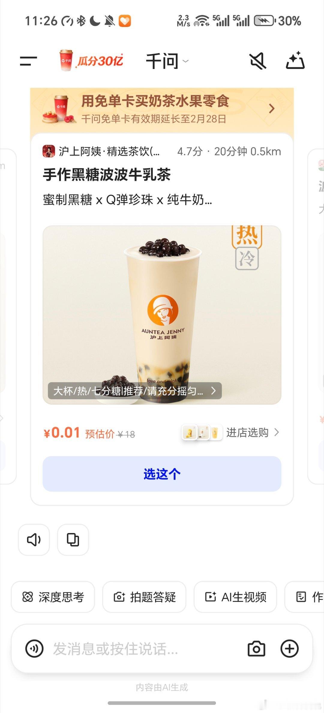 千问 免费奶茶早上的时候就点了,现在系统繁忙点不了了。