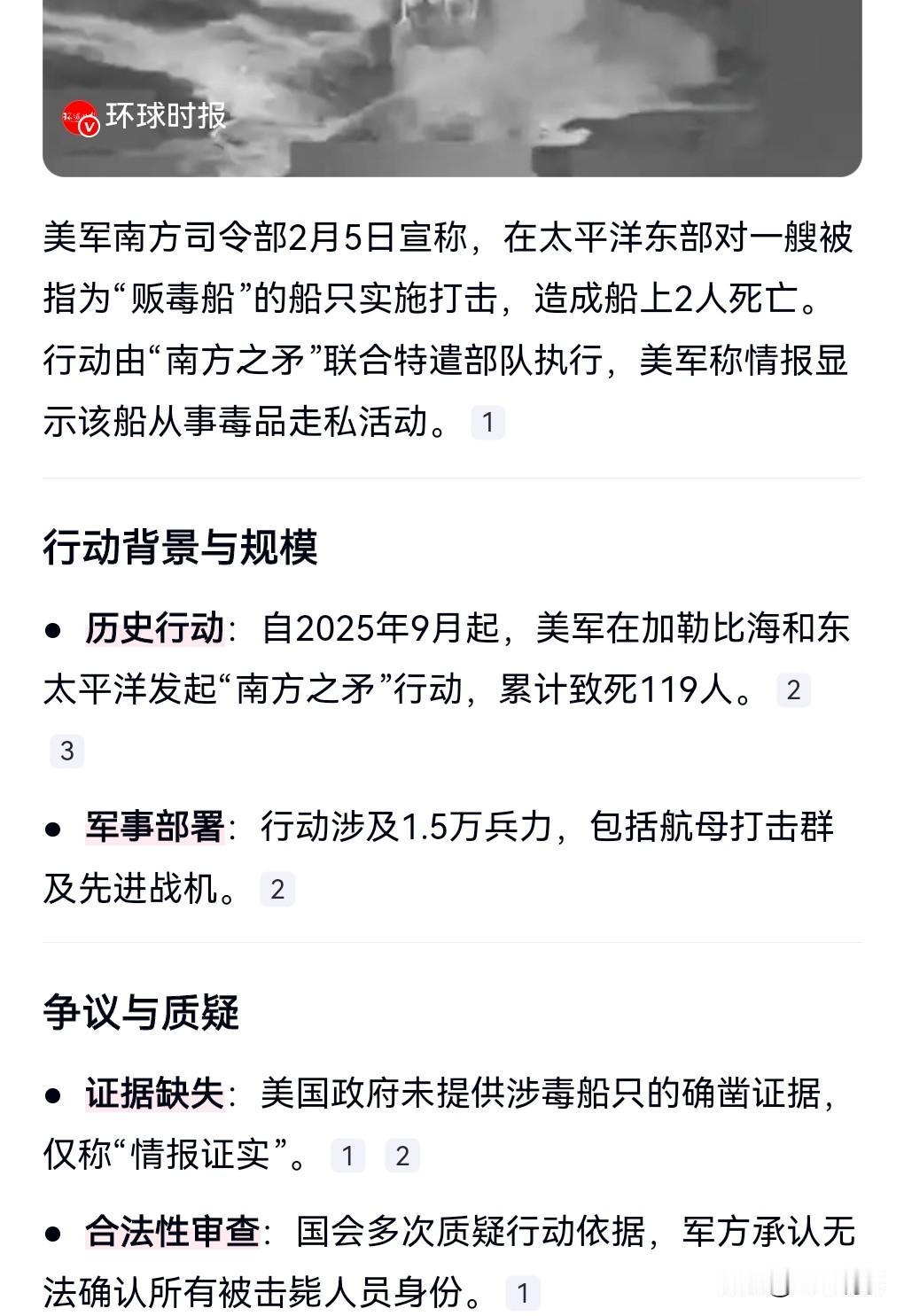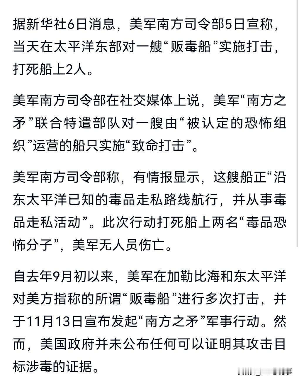 美军又在草菅人命了,又在故意杀人了。 2月5日美方称,美在太平洋东部发动袭击。 又以打击毒品为名,杀害了两人。 真的是丧心病狂到极点。 美方口口声声说打死的是贩毒的人,但又提供不出半点证据。 很多人被以莫须有的罪名给杀害了。 这真的是太无法无天了,假设对方真是毒贩,那么也应该审判,也不能直接打死吧。 况且那些人也不一定是毒贩。