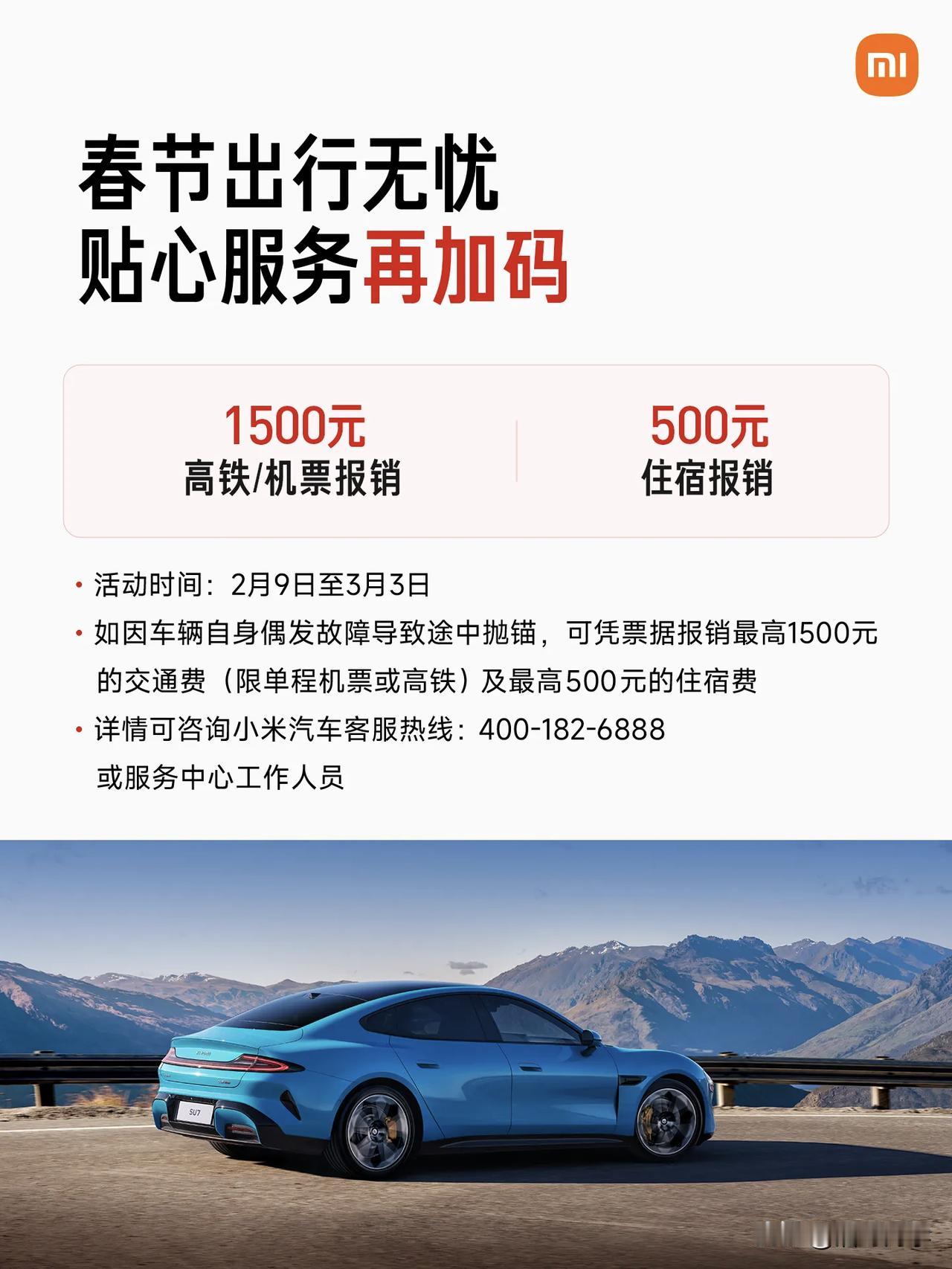 作为国产新势力汽车品牌,小米汽车提供全方位的春节无忧出行服务。比如,除了门店、服务中心、线上服务不会打烊以外,还提供2月9日~3月3日期间的全天候免费道路救援和贴心服务,让众多小米车主出行完全无忧。春运期间,很多在外工作的小米车主都会选择自驾回老家,由于春运期间车流量较大,难免会出现一些交通意外,小米汽车在这个时候官宣提供这些无忧服务,真的给了广大小米车主充足的信心。小米汽车 小米汽车品质 小米汽车犹豫期 小米进军豪华车 小米汽车宣传图 华为小米汽车 小米汽车政策
