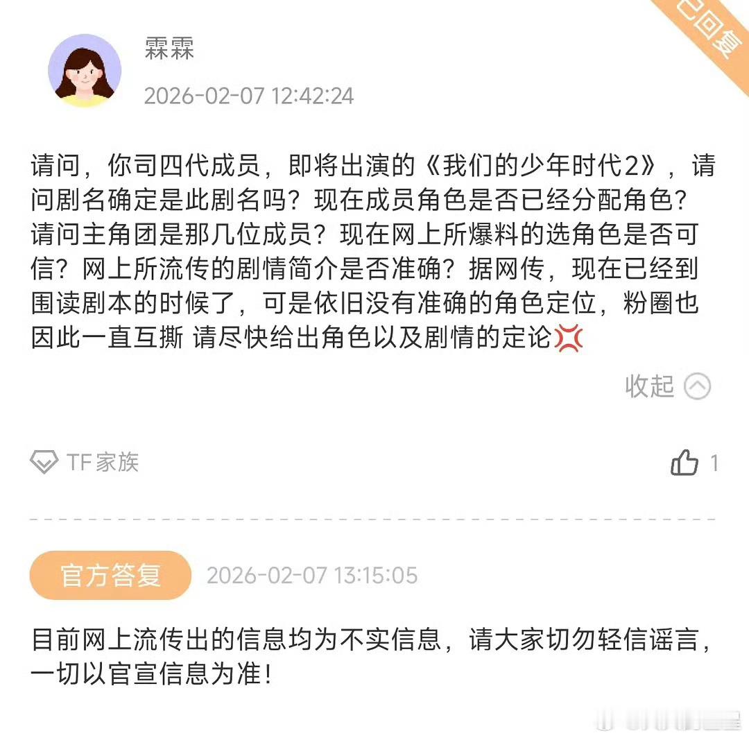 时代峰峻回应《我们的少年时代2》网传信息,称均为不实信息。