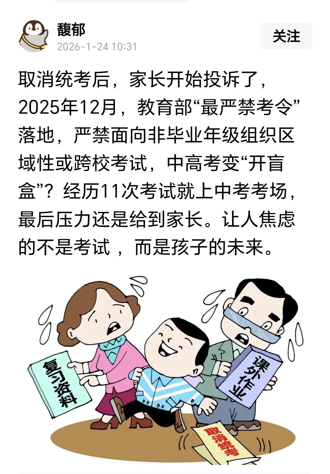 减负不是蒙眼赛跑,教育要温度,更要看得见的刻度——教育新规说不统考、不排名,想给孩子减负,可这负担真的减了吗? 统考变成校内测评,排名改成等级评价;学校不发的课外资料,家长需要连夜打印。孩子书包没轻,家长倒成了编外教师,查题、陪读、找资料全包干。 治标不治本的减负,不过是把学校的压力,全转移给了家长和孩子。 成长需要参照,教育需要温度也需要刻度,不是一刀切抹去所有考试,而是用更科学的方式,关注进步、因材施教。 别让减负变成蒙眼赛跑,我们需要为孩子减负,但也需要指引他们前行的“导航仪”。只有当学校、家长和孩子能共同看到成长的全貌,却不被单一数字束缚时,教育才能真正轻盈起来,孩子才能跑得更远。