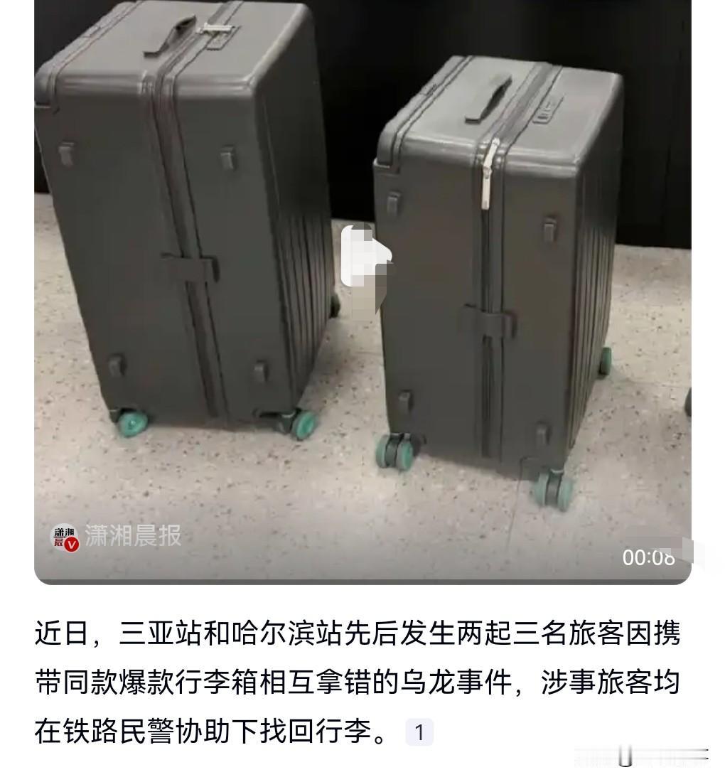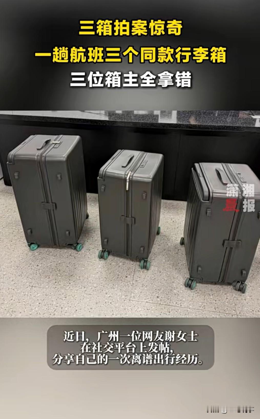 这真是无巧不成书啊。想不到黑色箱子这么受欢迎,大家果然还是比较中意这一款啊。 近日一位网友发帖称,一趟航班3个同款行李箱3位箱主全拿错。 仔细看的话,有一个箱子明显小一点。 不过如果没有在一起参照的话,那确实容易拿错。 不过在民警的帮助下,最后也是各自物归原主,民警说十几年第1次见到这种情况。