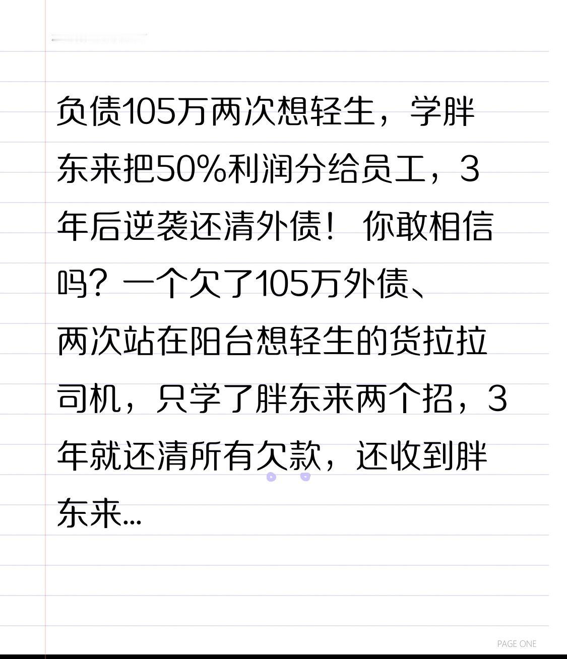 负债105万两次想轻生,学胖东来把50%利润分给员工,3年后逆袭还清外债! 你敢相信吗?一个欠了105万外债、两次站在阳台想轻生的货拉拉司机,只学了胖东来两个招,3年就还清所有欠款,还收到胖东来创始人亲自寄来的4箱礼物!他到底学了啥? 河南郑州的于先生,原本是个踏实的货拉拉司机,每月挣5000块勉强糊口。看着身边人创业赚钱,他也动了心,凑钱投身物流行业,本想拼出一番天地,没想到现实狠狠给了他一巴掌——合作商跑路、货物损毁赔偿,一连串打击让他背上105万巨额外债。 催债电话从早打到晚,亲友躲着他走,家里的积蓄全被掏空,连孩子的学费都凑不齐。最绝望的时候,他两次爬上阳台想一了百了,都被妻子死死拉住。就在人生跌入谷底时,两次逛胖东来的经历,彻底改变了他的命运。 第一次走进胖东来,他被超市里的场景震惊了:员工脸上没有紧绷的焦虑,反而带着发自内心的笑容;顾客退货不用多费口舌,哪怕是穿过的西装都能全额退款;商品标签上不仅标售价,还公开进价和毛利率,让人心甘情愿消费。第二次去,他特意观察管理模式,发现这里没有严苛的打卡制度,员工却比谁都卖力。 于先生突然顿悟:胖东来的成功,根本不是低价和装修,而是把人放在心上!他决定死马当活马医,照搬胖东来的核心逻辑,在自己的小物流公司推行两大改革:第一,把公司50%的利润全部分给员工;第二,取消打卡考勤,只要完成工作,员工想居家办公、灵活到岗都可以。 这个决定一出,立刻引来一片嘲讽。亲友说他“脑子进水”,创业不赚钱还倒贴;同行笑他异想天开,“员工不盯就摸鱼”。果不其然,改革初期就出了问题:有员工真的天天不来公司,业绩却没下滑,还有人自发加班优化物流路线,这让于先生也慌了神,难道真的学错了? 可没想到,转折点很快出现。因为利润分成实在,员工从“被动打工”变成了“为自己赚钱”:有业务员年出勤不足60天,却凭着精准对接客户,月收入超万元;仓库管理员主动琢磨降本方法,把货物损耗率从8%降到2%;客服更是把客户当家人,有客户货物延误,员工自掏腰包买水果道歉,硬生生把投诉变成了长期合作。 人心齐了,生意自然火了。以前公司每月就几单生意,改革后订单量翻了十几倍,利润节节攀升。3年后,于先生不仅还清了105万外债,还攒下了家底,公司也步入良性循环。更让他惊喜的是,他通过朋友联系到胖东来创始人于东来,分享自己的逆袭经历后,竟收到了对方寄来的满满四大箱礼物,这份认可让他热泪盈眶。 很多人说胖东来模式“不可复制”,但于先生用亲身经历证明:最值得学的,是“利他”的底层逻辑。现在太多老板总想着怎么管控员工、怎么套路客户,却忘了商业的本质是人与人的连接。你对员工不吝啬,员工就会对你掏心掏肺;你对客户不套路,客户就会用真金白银支持你。 于东来曾说:“挣钱是为了更好地生活,不是让生活被工作裹挟。” 于先生的故事也告诉我们:创业不是单打独斗,更不是投机取巧。把尊重给员工,把真诚给客户,把初心留给自己,哪怕起点再低,也能走出一条康庄大道。 在这个内卷的时代,我们总在追逐捷径和快钱,却忘了真诚永远是必杀技。如果你也认同这种经营理念,点赞转发,让更多创业者看到:把人放在心上,生意才会走得远!