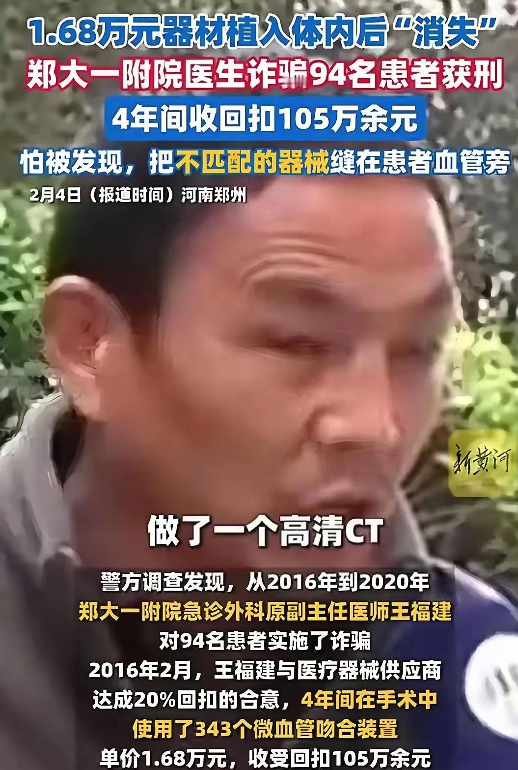 让人觉得讽刺的事情发生了 高知得医生让病人买的昂贵的不适配器械 竟然在患者的身体“消失”不见了 谁能想到,病人本来就因生病,内心纠结,生活在水深火热里,到医院,还要被王福建医生推荐必须用高端的耗材,医用器材,几万以上。 关键是有些病,根本就用不上这么贵的东西,担心病号知道发了钱,没有用,他王福建竟然想了一招,罔顾患者生命安全,将这些无用器械缝在病人血管旁边。 ​ 目的是卖了器材,拿到提成,他简直不把人命当回事。可恨,替病号可悲!