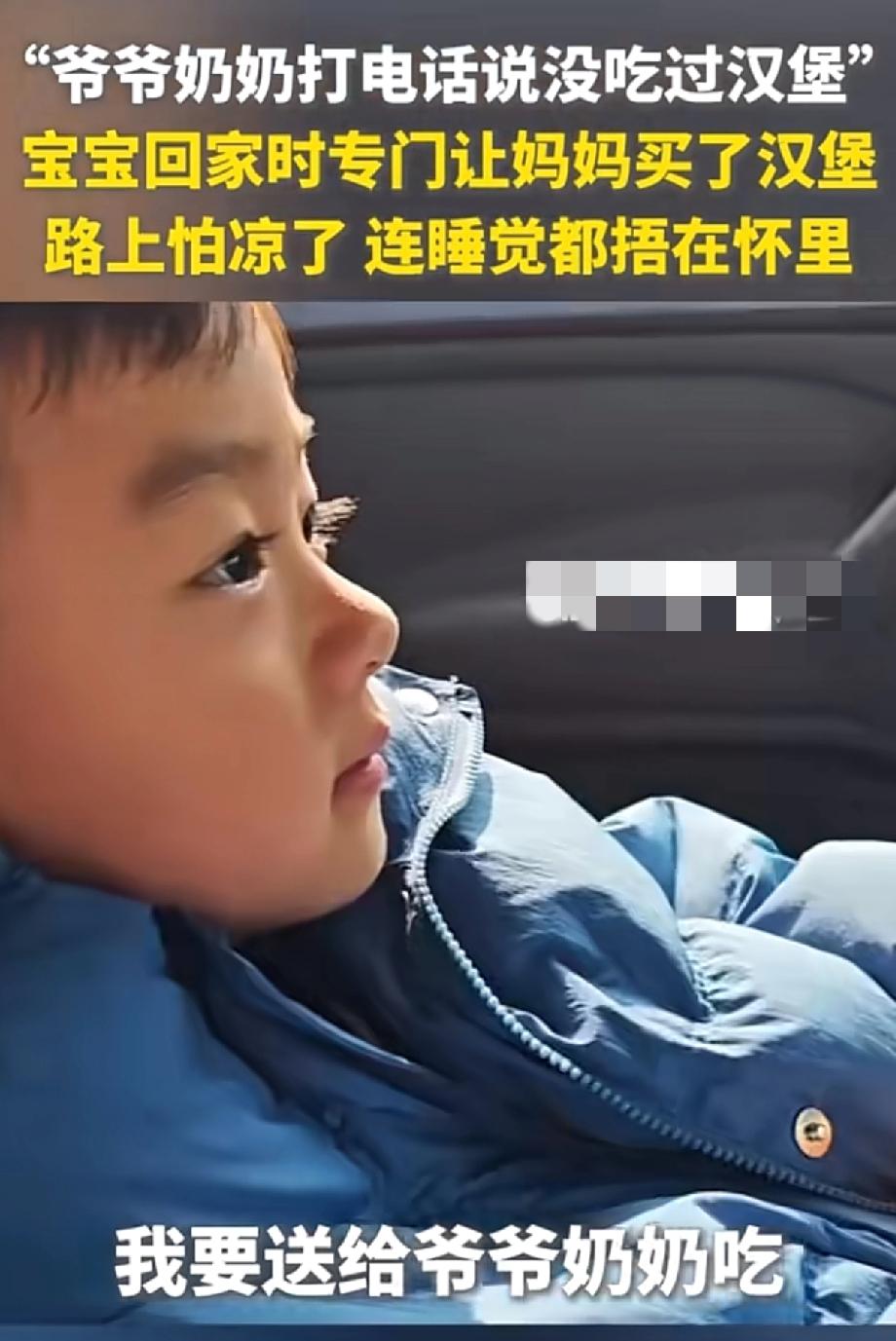 一位小男孩之前打电话听到爷爷奶奶在视频里开玩笑说“没吃过汉堡” 这个小男孩就悄悄的记在了心里 回老家前,他特意让妈妈买了两个汉堡,路上全程把汉堡揣在怀里,怕汉堡凉了,连睡觉都紧紧抱着 一到爷爷奶奶家,他第一时间从怀里掏出“宝贝”,给爷爷看他带回来的汉堡,爷爷也是满脸笑容的接过汉堡 这哪里是汉堡啊,这分明是孩子最纯粹的孝心[呲牙][赞][赞]