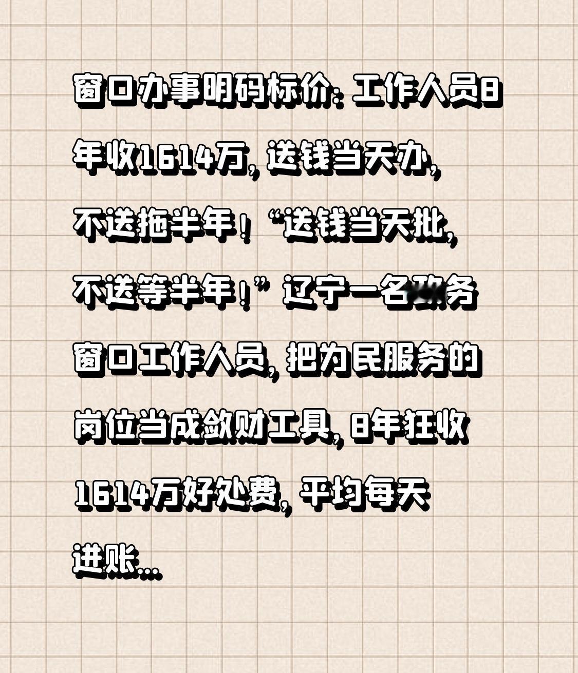 窗口办事明码标价:工作人员8年收1614万,送钱当天办,不送拖半年! “送钱当天批,不送等半年!” 辽宁一名政务窗口工作人员,把为民服务的岗位当成敛财工具,8年狂收1614万好处费,平均每天进账5500元,比普通上班族月薪还高!这样的“窗口硕鼠”,把老百姓的信任踩在脚下,实在令人发指。 2026年2月,辽宁省委巡视组曝光的这起贪腐案,撕开了政务服务的遮羞布。涉案的王某某,本是省住建厅驻政务大厅的普通办事员,负责企业施工许可证、资质审批等业务。可谁能想到,这个看似平凡的岗位,竟成了他的“提款机”。 企业主们的遭遇堪称血泪史:某老板为办施工许可证,前后跑了11次窗口,每次都被以“材料不全”“系统故障”为由拒绝,直到塞了2万元红包,第二天就拿到了审批;还有创业者想办工商注册,被告知“正常流程要等3个月”,通过中介给王某某送了5000元“加急费”,当天就完成了登记。在他这里,政务服务彻底变成了“明码标价”的生意,好处费从几千元到几十万元不等,涉案违规审批事项超3000件,覆盖建筑、医疗、金融等多个敏感行业。 更让人愤怒的是,这些“带病准入”的企业,不少没有实际经营场所、缺乏专业资质,却凭着好处费顺利拿到许可,不仅扰乱了市场秩序,更埋下了公共安全隐患。而王某某自己则过得奢靡无度,名下有两套高档住宅、一辆进口豪车,频繁出入高端会所,把榨来的民脂民膏挥霍一空。 可他的嚣张,终究没能逃过监督的眼睛。转折点出现在2025年10月,辽宁省委巡视组进驻住建系统,通过核查银行流水发现了异常:王某某8年内有上千笔小额存款,单笔金额从几百到数万元,明显与收入不符。顺着线索深挖,一个通过现金交易、亲属账户转移赃款的完整利益链浮出水面,最终查实他累计收受好处费高达1614万元。 更讽刺的是,这起案件暴露出的监管漏洞触目惊心。政务大厅内部监督形同虚设,审批流程缺乏有效制约,王某某仅凭对业务的熟悉和与后台人员的勾结,就能随意操控审批进度。就像上海杨浦区曾曝光的窗口腐败案一样,领导“宽松软”管理、制度存在空白,让贪腐分子有机可乘,甚至出现“一人贪腐,多人跟风”的破窗效应。 但法律从来不会姑息贪腐。根据我国刑法,受贿1614万已属于“数额特别巨大”,且情节特别严重,王某某将面临十年以上有期徒刑甚至无期徒刑,并处50万元以上罚金,涉案赃款也会被全部追缴。这不是个例,近年来从上海到辽宁,从医保窗口到政务大厅,一批“窗口硕鼠”接连落马,彰显了党中央“零容忍”的反腐决心。 政务窗口是政府与群众的连心桥,本应是为民服务的阵地,却被少数人当成敛财的工具。这些人的行为,损害的不仅是老百姓的切身利益,更是政府的公信力。好在巡视利剑高悬,制度笼子越扎越紧,随着纪检监察建议的落实,审批流程全程留痕、监督机制不断完善,让权力不再任性。 权力是人民赋予的,只能用来为人民服务。每一个政务工作者都该牢记:手中的公章不是敛财的筹码,为民办事的岗位更容不得半点私心。如果你也痛恨这种“办事难、办事贵”的歪风邪气,点赞转发,让更多人看到反腐的决心,也让每一扇政务窗口都能真正成为为民服务的“暖心窗”!