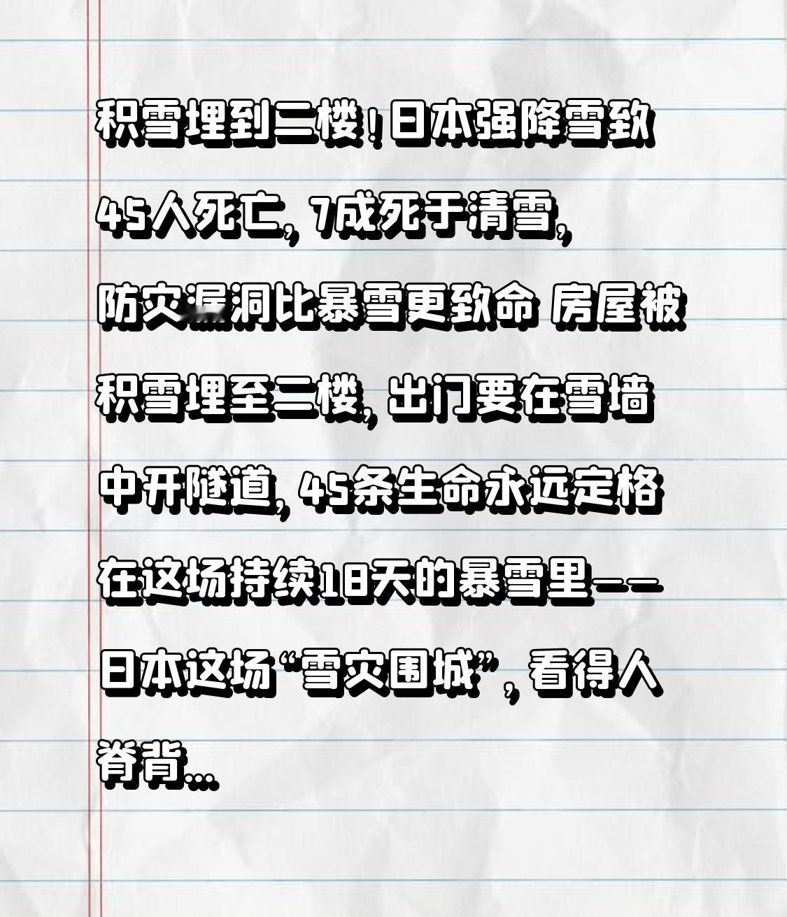 积雪埋到二楼!日本强降雪致45人死亡,7成死于清雪,防灾漏洞比暴雪更致命 房屋被积雪埋至二楼,出门要在雪墙中开隧道,45条生命永远定格在这场持续18天的暴雪里——日本这场“雪灾围城”,看得人脊背发凉!可更让人揪心的是,超七成死者不是被雪直接掩埋,而是死于本可避免的人为悲剧。 截至2月7日,日本总务省消防厅的通报触目惊心:强降雪已席卷10个道府县,造成45人死亡、540人受伤,新潟县就占17人,成为重灾区。青森县酸汤地区积雪更是突破4.53米,相当于两层楼的高度,创1986年以来最高纪录;新潟县十日町市积雪达255厘米,是往年同期的6倍,居民出门只能在齐胸深的积雪中艰难挪动。 交通早已全面瘫痪:北海道新千岁机场取消1400多班航班,9000名旅客滞留,候机厅铺起简易床位,便利店货架被抢购一空;JR北海道线停运上千班次,高速公路全封闭,除雪车在齐轮积雪中寸步难行。更致命的是民生危机,新潟县部分区域停电超72小时,零下十几度的严寒中,独居老人的生存状况岌岌可危。 但最让人痛心的转折点来了:这场灾难远不止是天灾。日本总务省消防厅调查显示,45名死者中,超70%死于屋顶除雪事故——日本传统建筑屋顶坡度缓,难以承受极端积雪压力,居民清雪时频繁遭遇屋顶坍塌、雪块掩埋或失足坠落。秋田县一对老年夫妇系着安全绳清雪,仍被突然滑落的厚雪掩埋,救援人员数小时后才找到遗体;北海道92岁老人未系安全绳登高,不幸失足坠亡。还有山形县一家三口,被困车内怠速取暖却忘了通风,最终全员一氧化碳中毒身亡,成为最令人扼腕的家庭悲剧。 更残酷的是,超70%死者是65岁以上老人,灾区老龄化率普遍超35%。许多独居老人无力清雪、无法外出采购,有的在低温中孤独离世,有的冒险爬屋顶清雪却酿成惨剧。而这背后,是日本防灾体系的全面滞后:全国三分之一乡镇没配备除雪车,2026年地方防灾基金比2023年减少23%,救援力量根本跟不上;气象厅的高级别预警,没能触达独居老人、外国游客等弱势群体,很多人陷入“信息孤岛”,直到灾难降临都没收到有效提醒。 好在灾难中也有暖流涌动。日本政府启动《灾害救助法》,1200名自卫队员动用装甲车和直升机转移2万余名被困民众;札幌市联动外卖平台启动“暴雪特别配送”,为滞留人员送热食;中国驻日使领馆设立咨询台,成功救出被困的6名中国公民。重灾村落里,年轻人主动给独居老人送餐送药,邻里互相铲雪开路,这些微小的善举,成了寒冬中最动人的光。 气象专家解释,这场暴雪是“大湖效应”与全球气候变化共同作用的结果——西伯利亚冷空气掠过日本海吸收水汽,遇山地抬升形成持续降雪,而北极涡旋不稳定让极端天气更频繁。这不仅是对日本的考验,更是全人类的气候警示。 45条逝去的生命提醒我们:天灾或许不可避免,但人祸本可防范。足够的防灾预算、完善的预警机制、对弱势群体的精准帮扶,才能在极端天气中守住生命底线。在自然伟力面前,人类何其渺小,但守望相助的力量、未雨绸缪的准备,总能抵御寒冬。 愿这场暴雪早日停歇,愿逝者安息,也愿每个国家都能从灾难中吸取教训,筑牢生命防线。如果你也为这场灾难揪心,点赞转发,让更多人关注极端天气下的生命安全,也向每一位救援者致敬!
