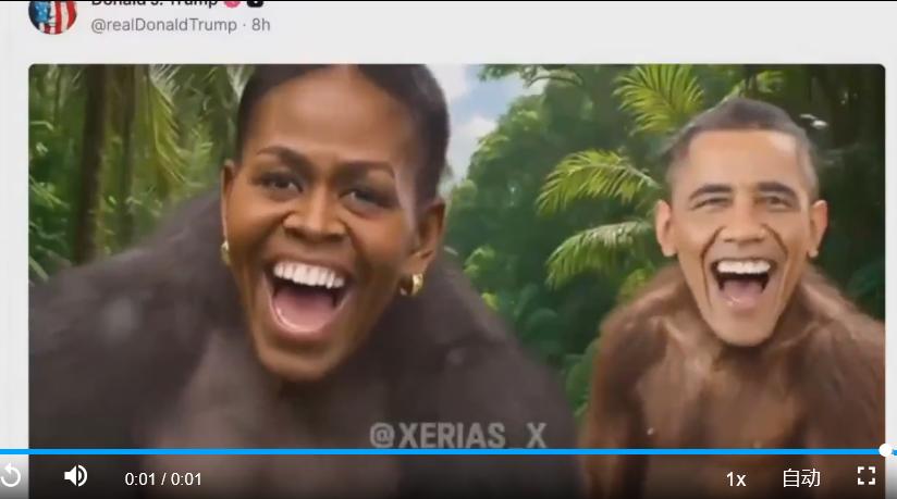 特朗普发视频影射奥巴马夫妇为猿猴:惹众怒后罕见删帖,甩锅“工作人员”,这点我就觉得老特太怂了,既然做了又不敢当,让我对他有点小失望了。不用道歉,非常和谐。特朗普自己是金毛狮王,人家也入了禽兽园。奥巴马任期内发动了乌克兰政变,推翻了利比亚政府, 还搞了个排除中国的TPP,并大言不惭地声称如果中国人的生活质量比肩美国人,是地球的大不幸。这些都不是灵长类动物干的事,我觉得懂王是抬举奥观海夫妇了。