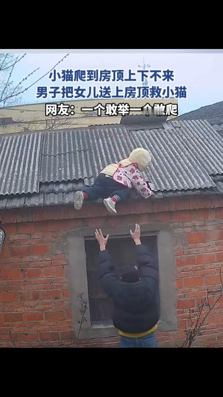 小猫爬到房顶上下不来,男子把女儿送上房顶救小猫。 网友:一个敢举一个敢爬。 2月