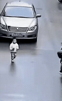 小小只不知危险,大模大样地走在马路上,一辆灰色轿车开过来没刹车,电瓶车小哥斜刺里撞向轿车的轮子,一位叔叔一个飞扑救孩子于水火。 孩子懵懂,遇见两位恩人解救自己。 骑电瓶车小哥很机智,是英雄,多亏他的重重一撞,孩子化险为夷;飞奔扑救孩子的是勇士。幼童生命大于天,中国人刻在骨子里的善良,为两位勇士点赞。