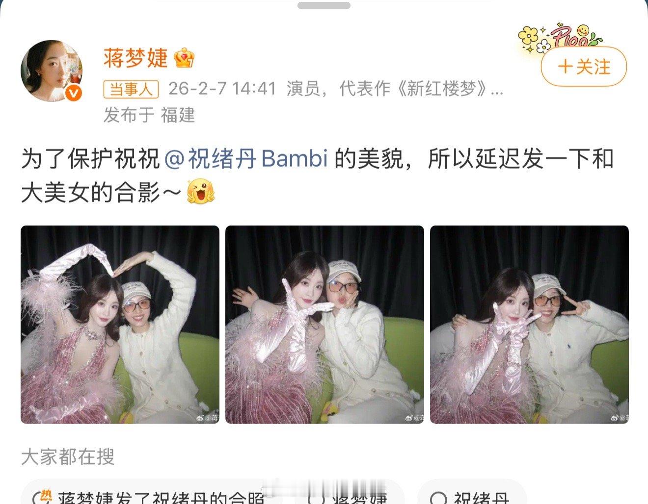 蒋梦婕发了祝绪丹的合照 这组合照看得人心情都变好了!蒋梦婕和祝绪丹两个人笑得很自然,比心比耶的小动作一看就是好朋友之间才会有的状态。能有这样的姐妹情谊真不错,她们的友情确实很打动人。