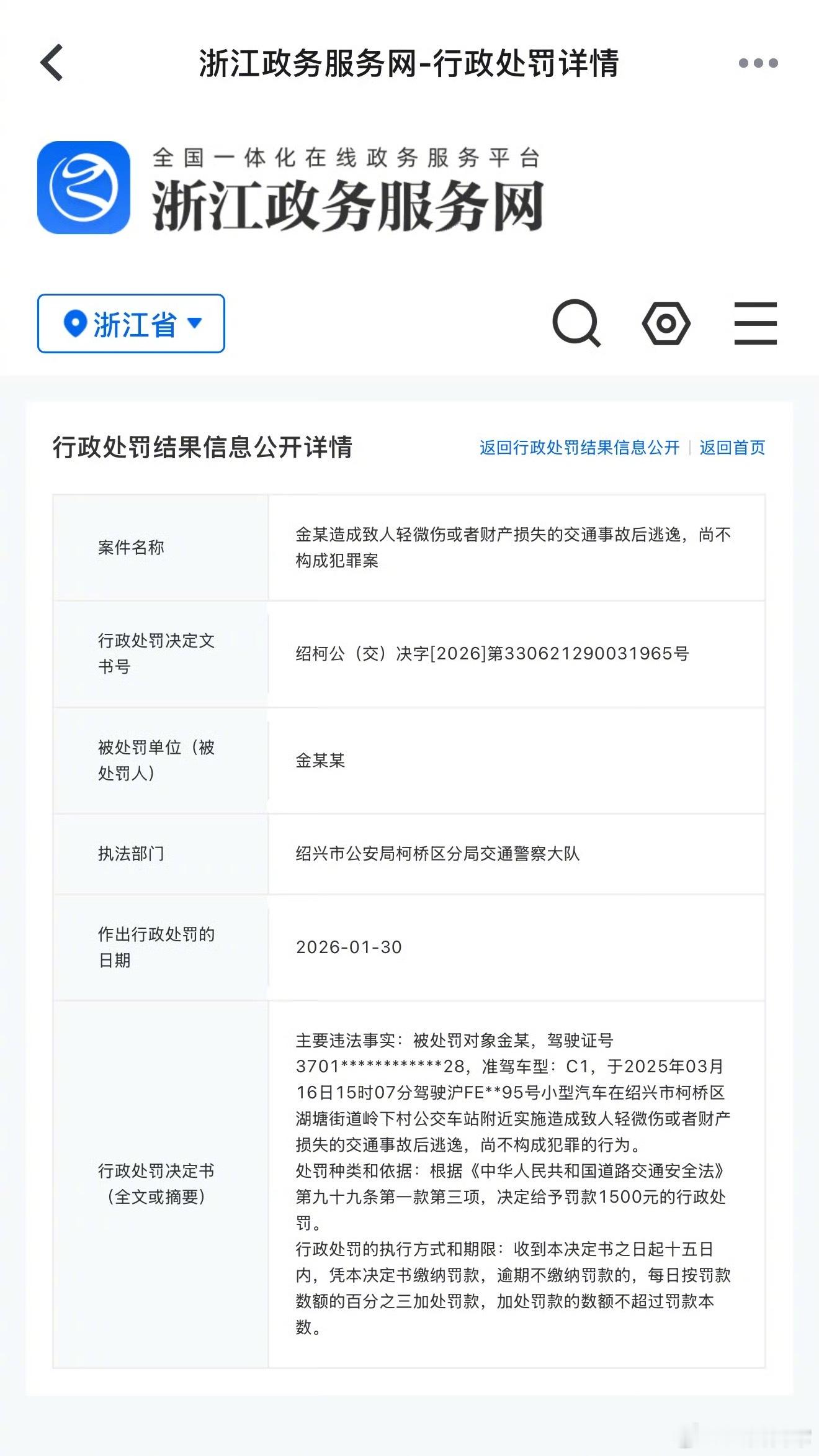 金晨被行政处罚1500元金晨肇事逃逸被罚1500元