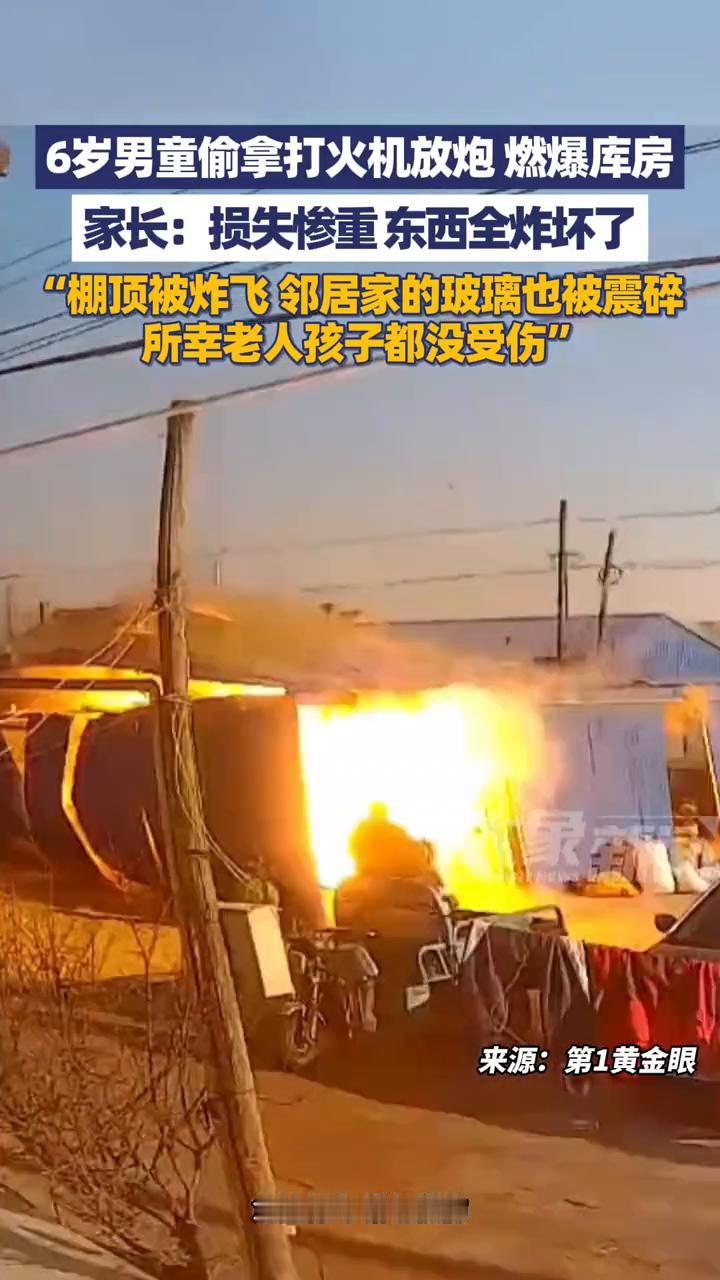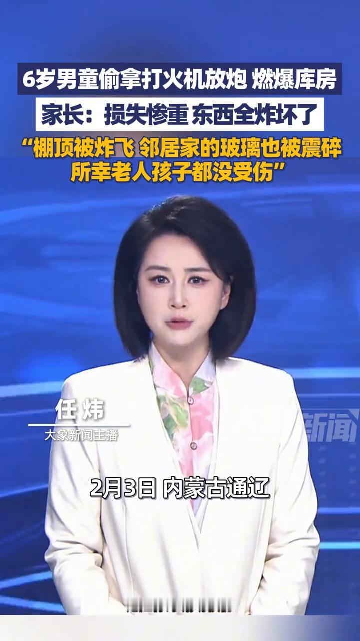6岁男童偷拿打火机放炮仗燃爆库房。 大象新闻主播任炜。 6岁男童偷拿打火机放炮燃爆库房。家长:损失惨重,东西全炸坏了。棚顶被炸飞,邻居家的玻璃也被震碎,所幸老人孩子都没受伤。 2月3日内蒙古通辽,年关将近,6岁的男孩趁家人不注意偷拿打火机进库房,把过年放的炮仗全点着后引发了爆炸。孩子爸爸说把棚子全炸开了,连邻居家的玻璃都被震坏了,威力老大了,幸好孩子和老人都没受伤。 提醒大家,家里有爆竹的一定要看好小孩,平安过年。