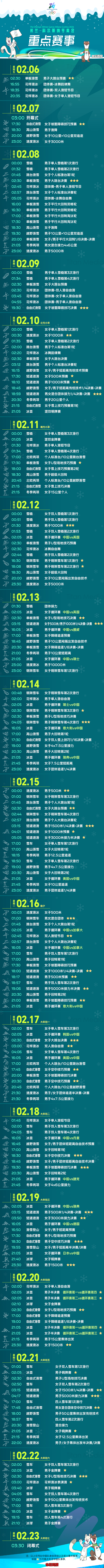 期待2026米兰冬奥会中国冰上军团的表现,当然更重要的是展现我们的精神风貌。2月10日19点:林孝埈、刘少昂领衔短道速滑,混合团体接力,这是中国卫冕首金之战 2月9日19点30分:谷爱凌在自由式滑雪女子坡面障碍技巧,冲击个人项目首金2月15日0点:速度滑冰男子500米,高亭宇卫冕战,冰面飞人对决2月17日凌晨:花滑双人滑自由滑,艺术与难度,中国队传统优势项目2月18日18点30分:自由式滑雪女子空中技巧项目,徐梦桃五战冬奥2月22日2点30分:自由式滑雪 女子U型场地:中国最强夺金点,谷爱凌的卫冕之战一起为中国冰雪加油!肖战冬奥短片滑冰首秀