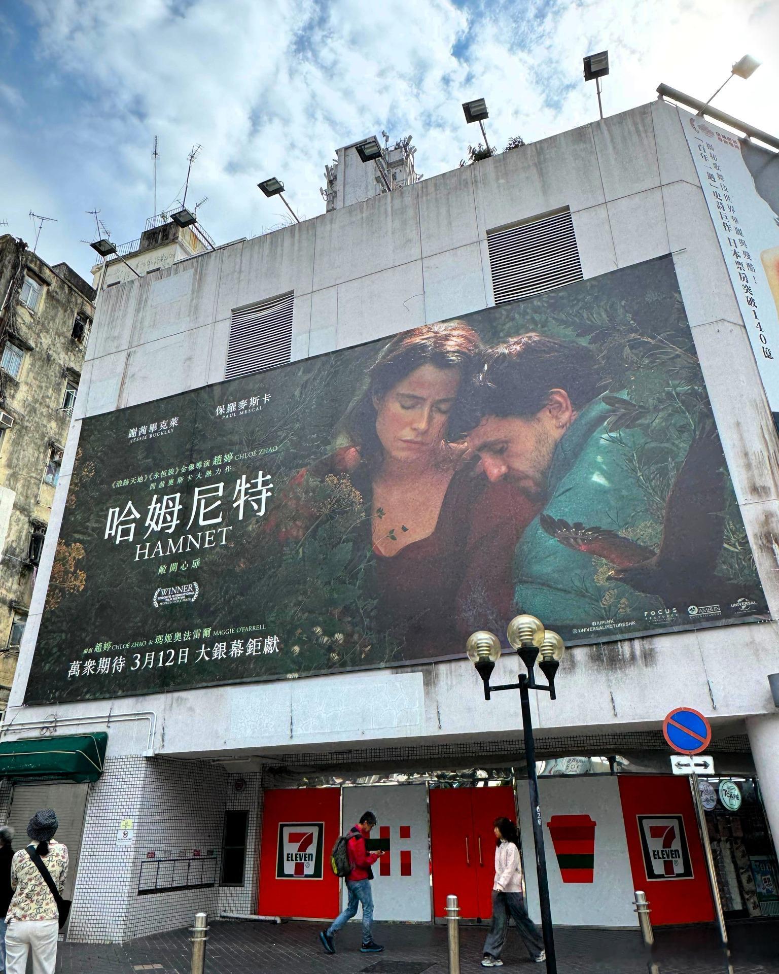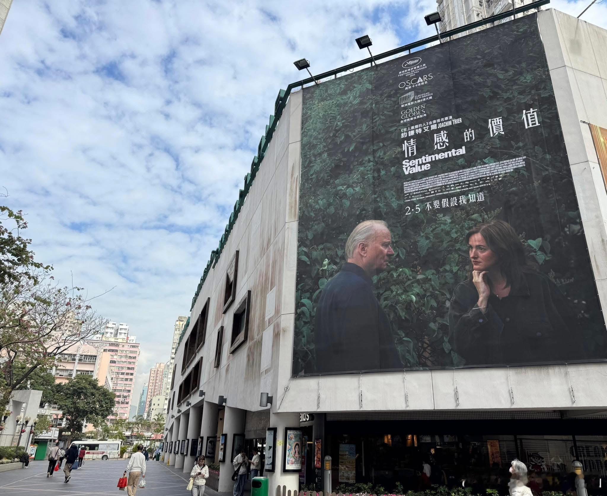 香港百老汇电影中心外墙上的《哈姆奈特》和《情感价值》巨幅海报
