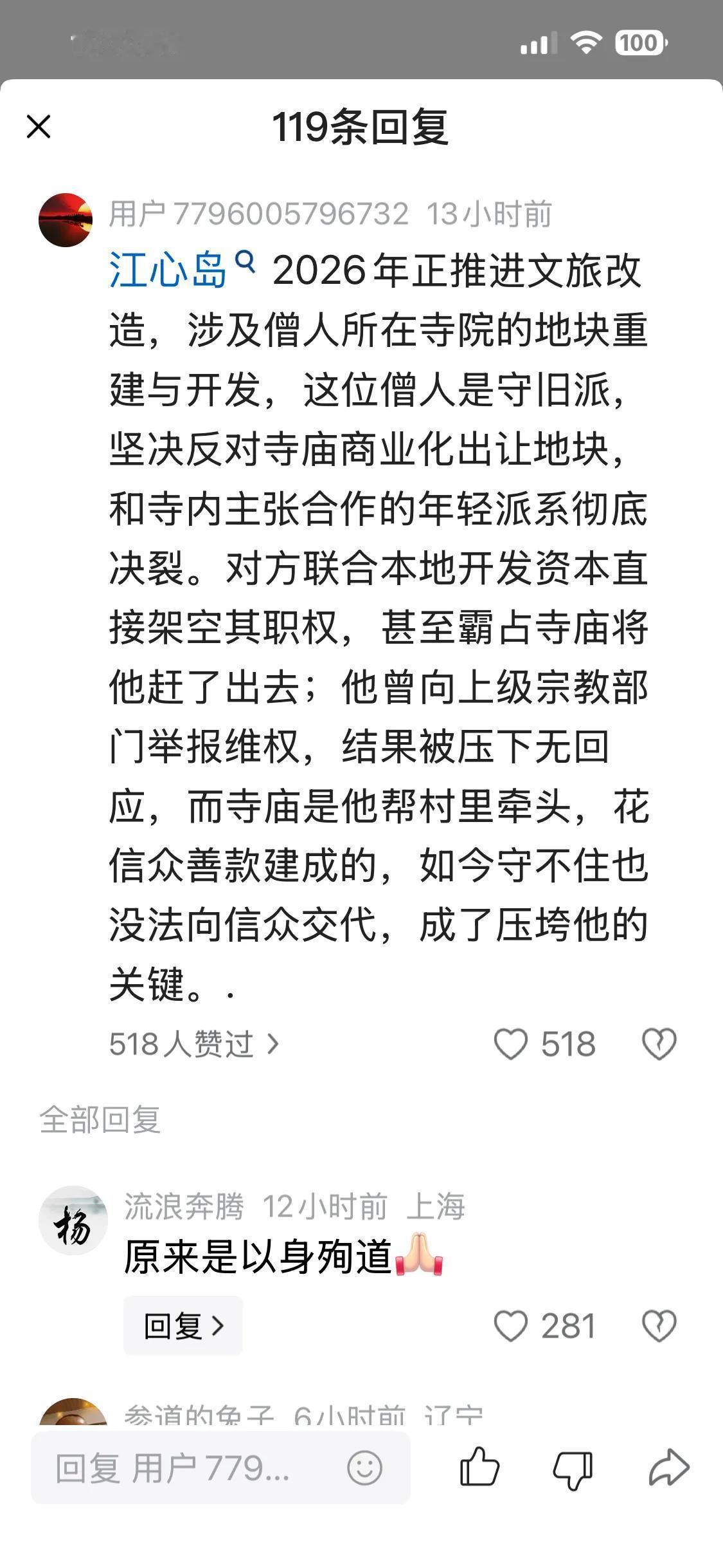 大师,这是怎么了?你有什么事想不开?跳河都是抑郁症或者活不下去的人,你是方外人士,应该深知“凡所有相皆是虚妄”。 有人的地方就有争斗就有是非。不惜用自己的生命去证明的一方,基本上是正义善良的一方。
