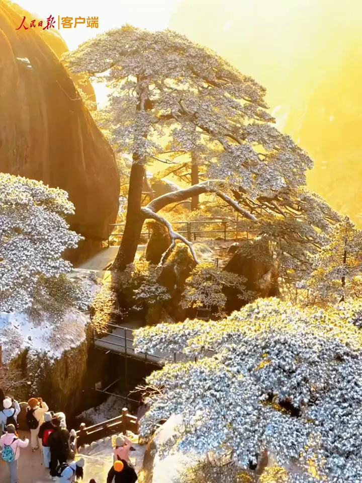 2月7日安徽黄山雪后初晴,金光洒满迎客松。 人民日报客户端。 摄影,多人民日报记者:朱笑镇。