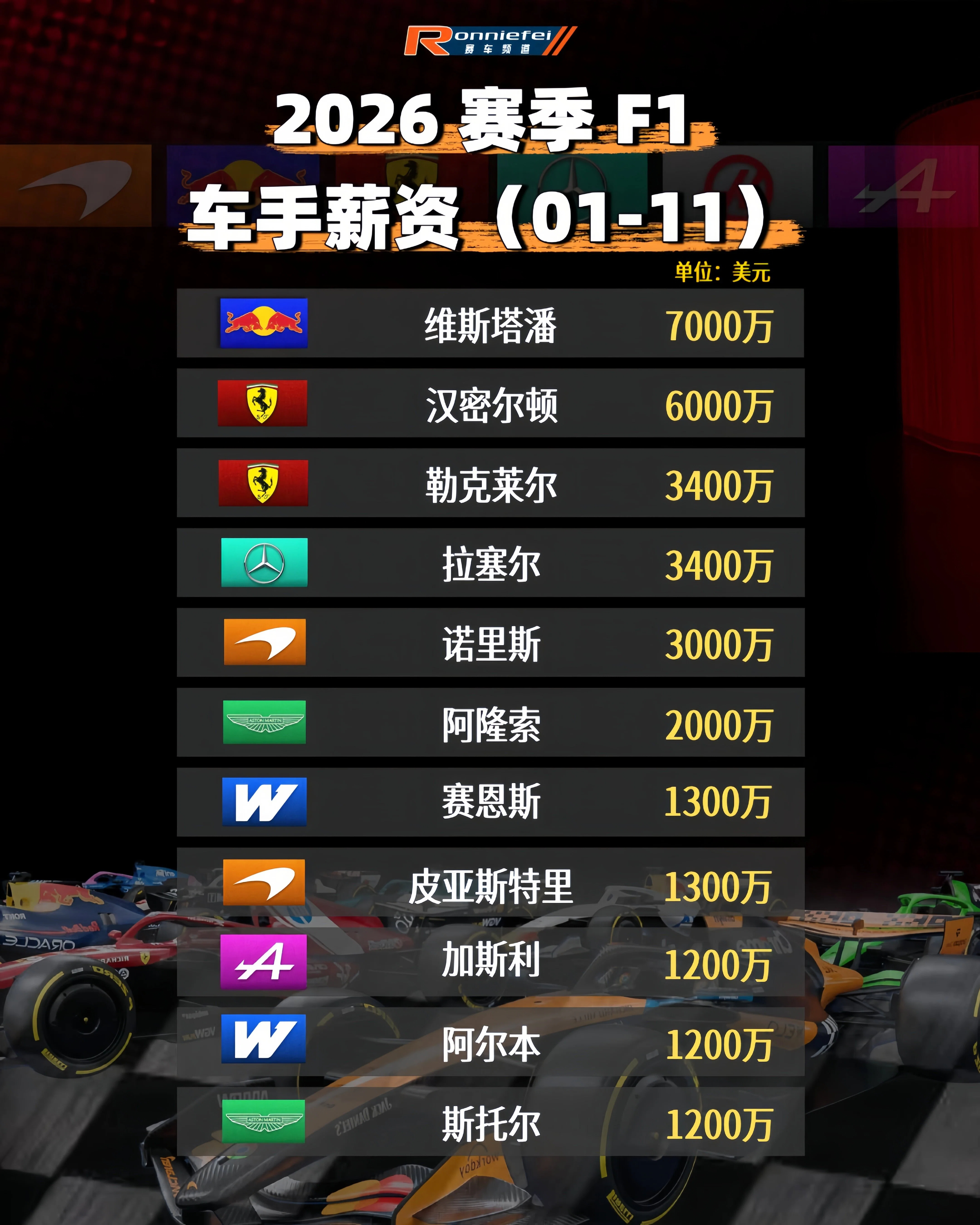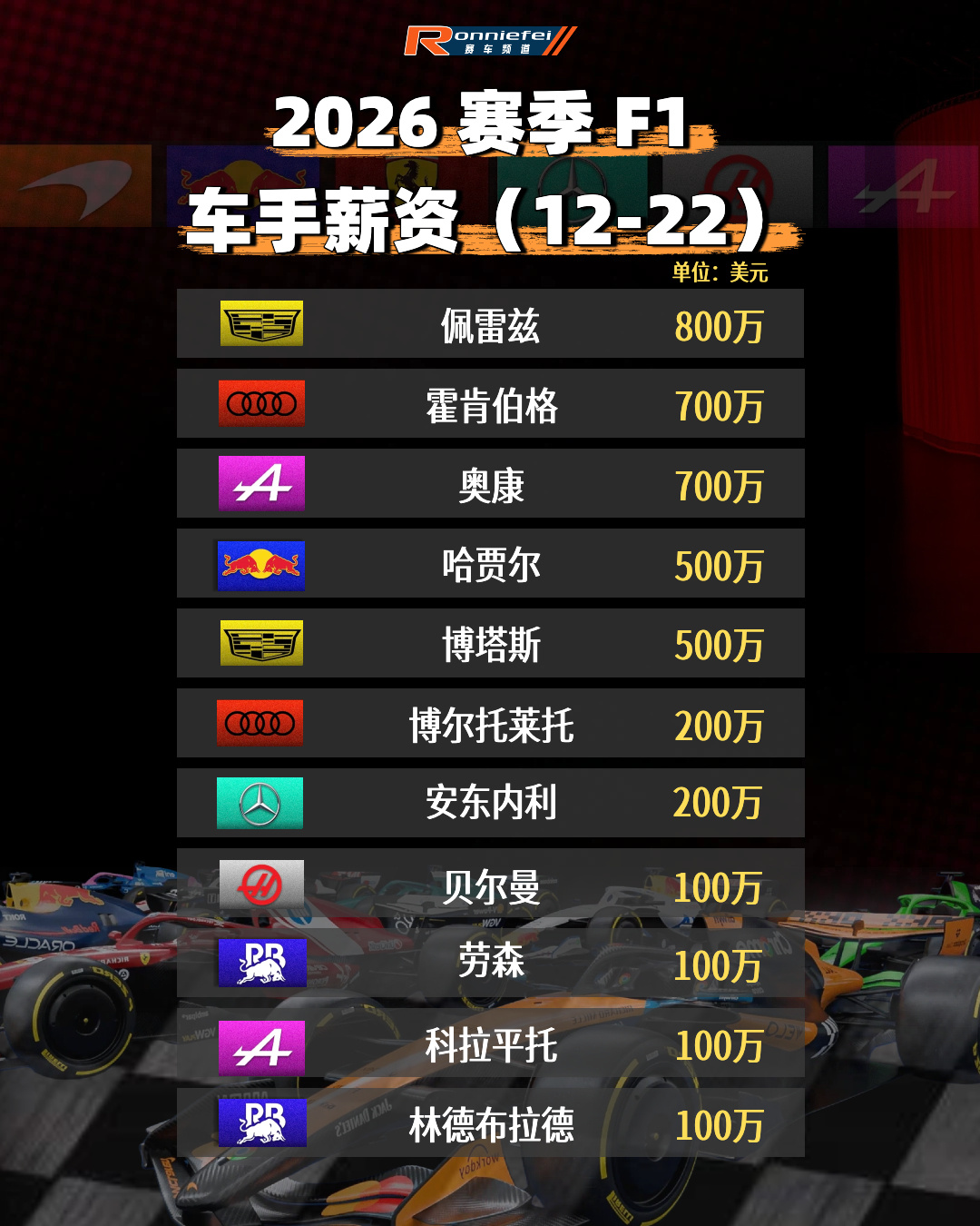 f1 车手们的大概收入有多少?根据RN365的数据做了一张图片,这里的收入仅仅是大概估算的基础年薪,不包括绩效奖金和个人赞助收入。