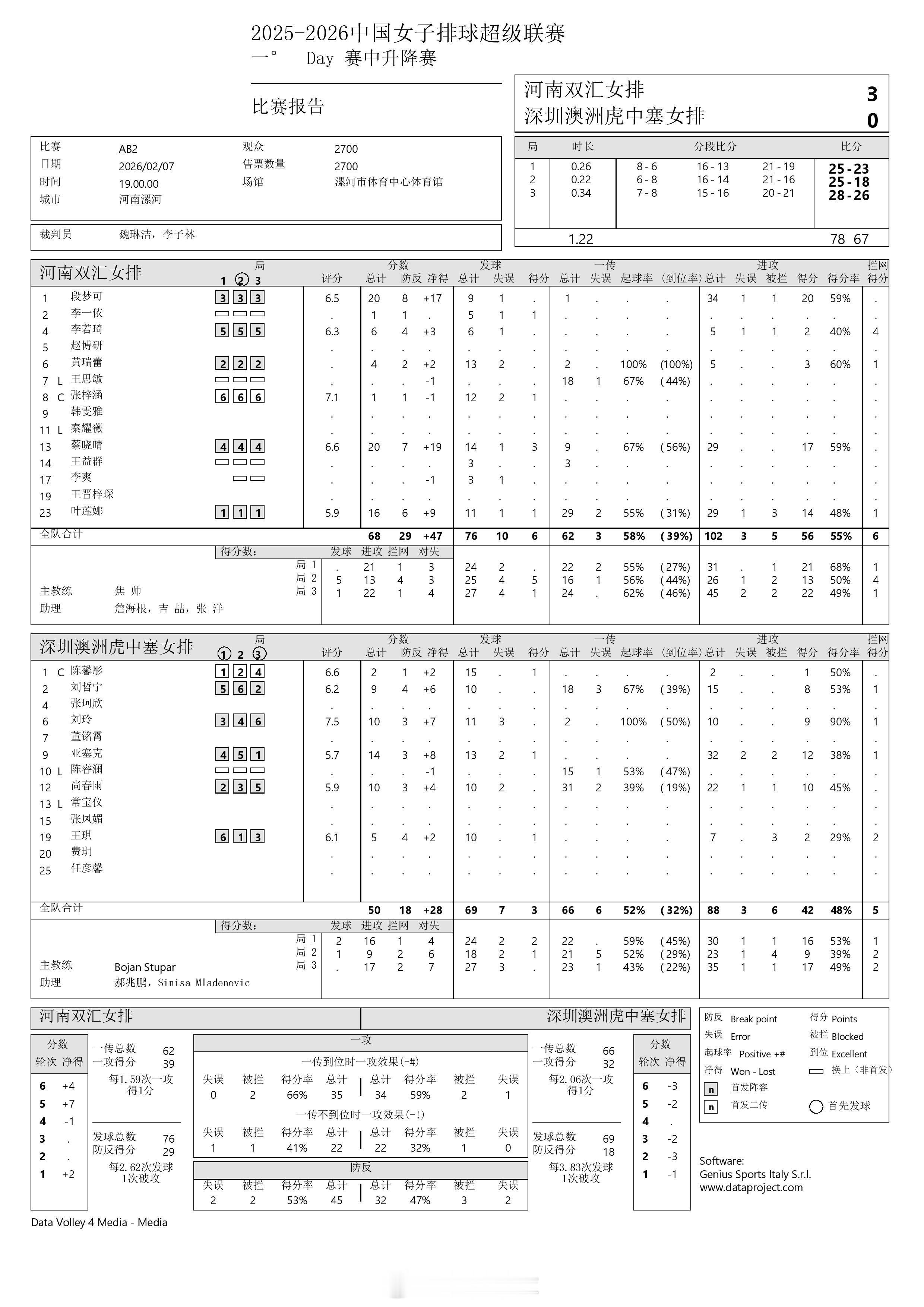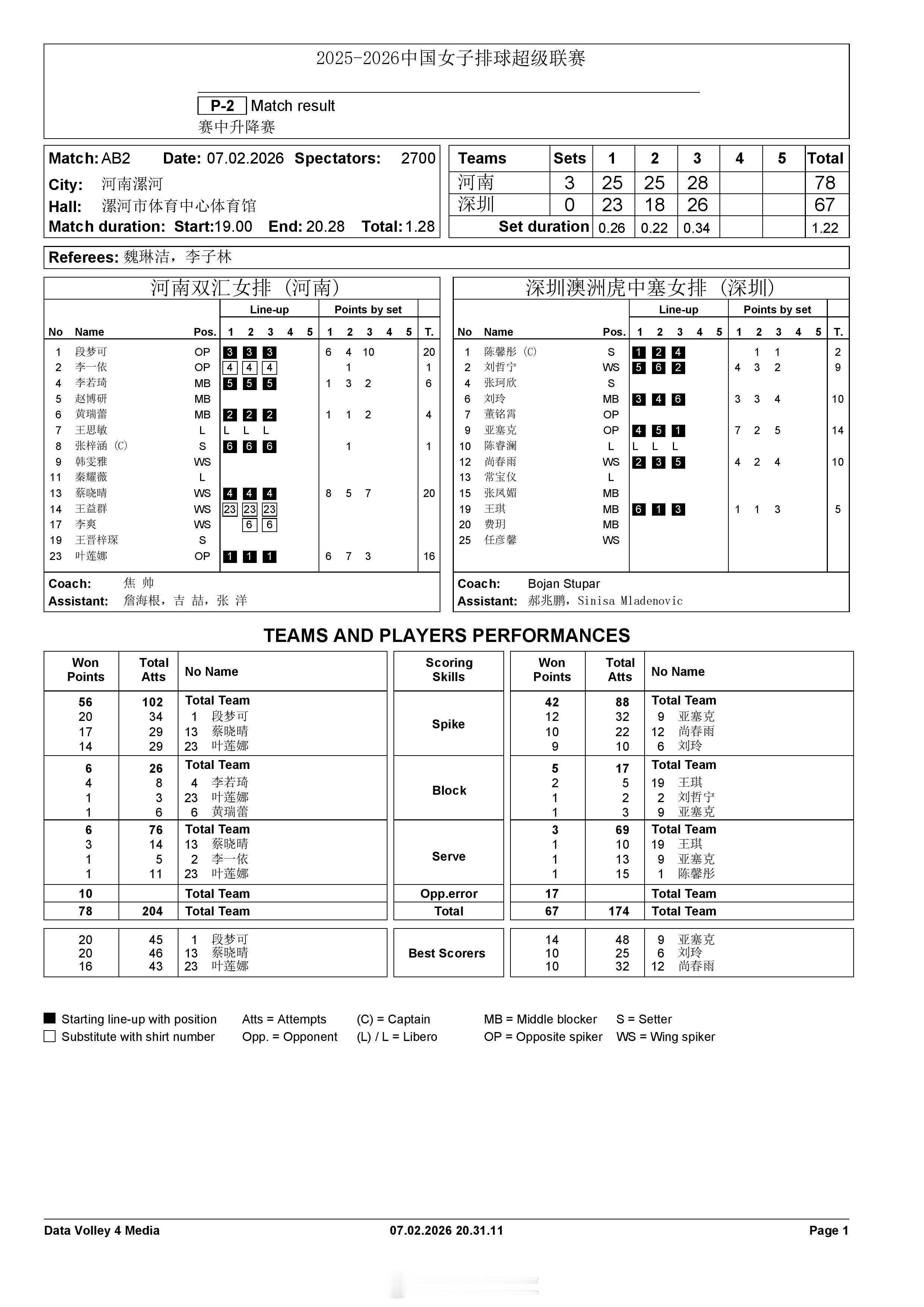 【中国女排超级联赛 河南3-0深圳】2月7日晚,赛中升降赛首回合,河南在主场以3-0(25-23, 25-18, 28-26)完胜深圳。段梦可、蔡晓晴各20分,叶莲娜16分,李若琦6分(拦4);亚塞克14分,刘玲、尚春雨各10分,刘哲宁9分。