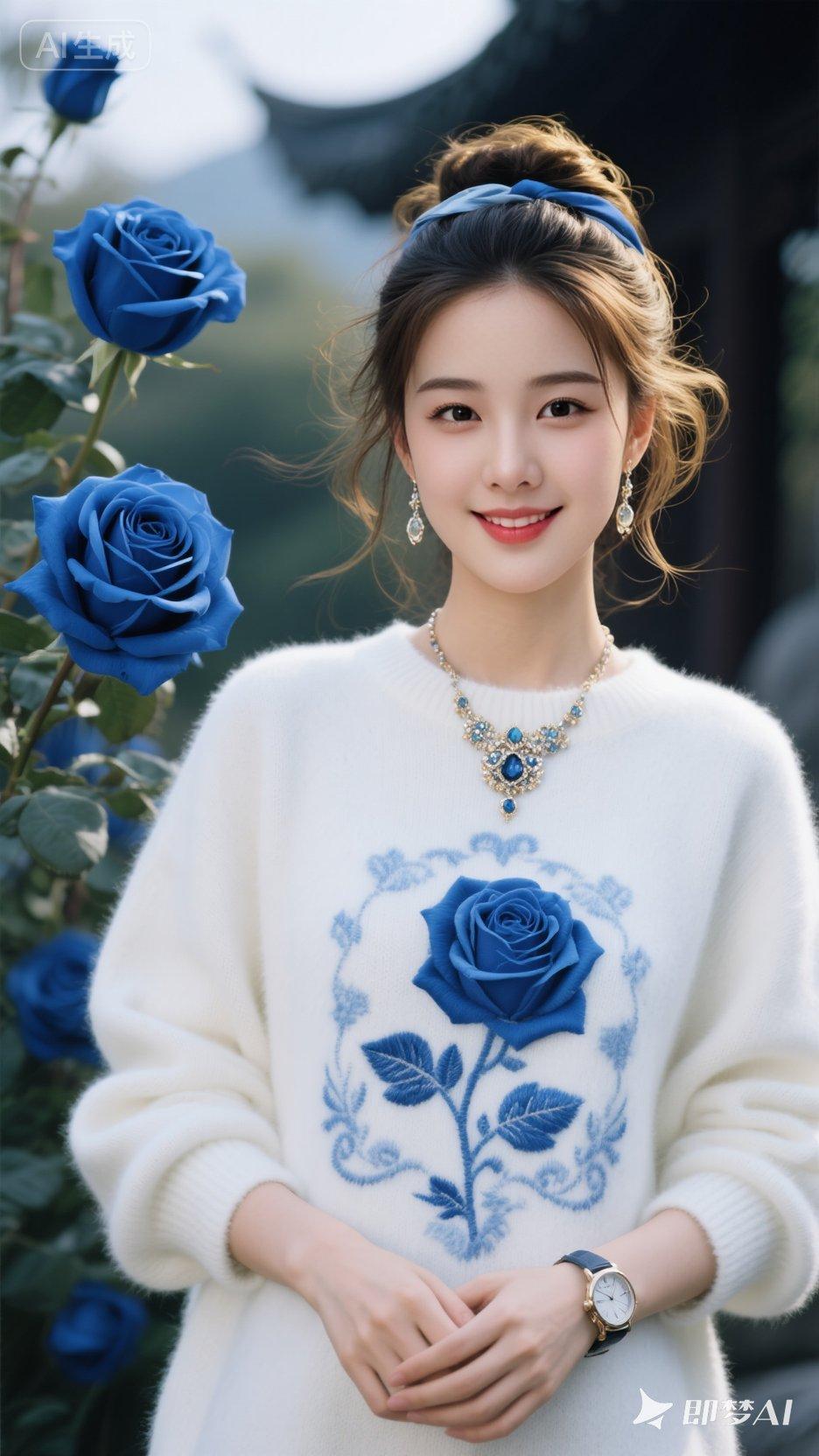 一位符合东方美学的20岁女神形象,她身着白色宽松大码羊绒套头衫有蓝色制绣,精致妆