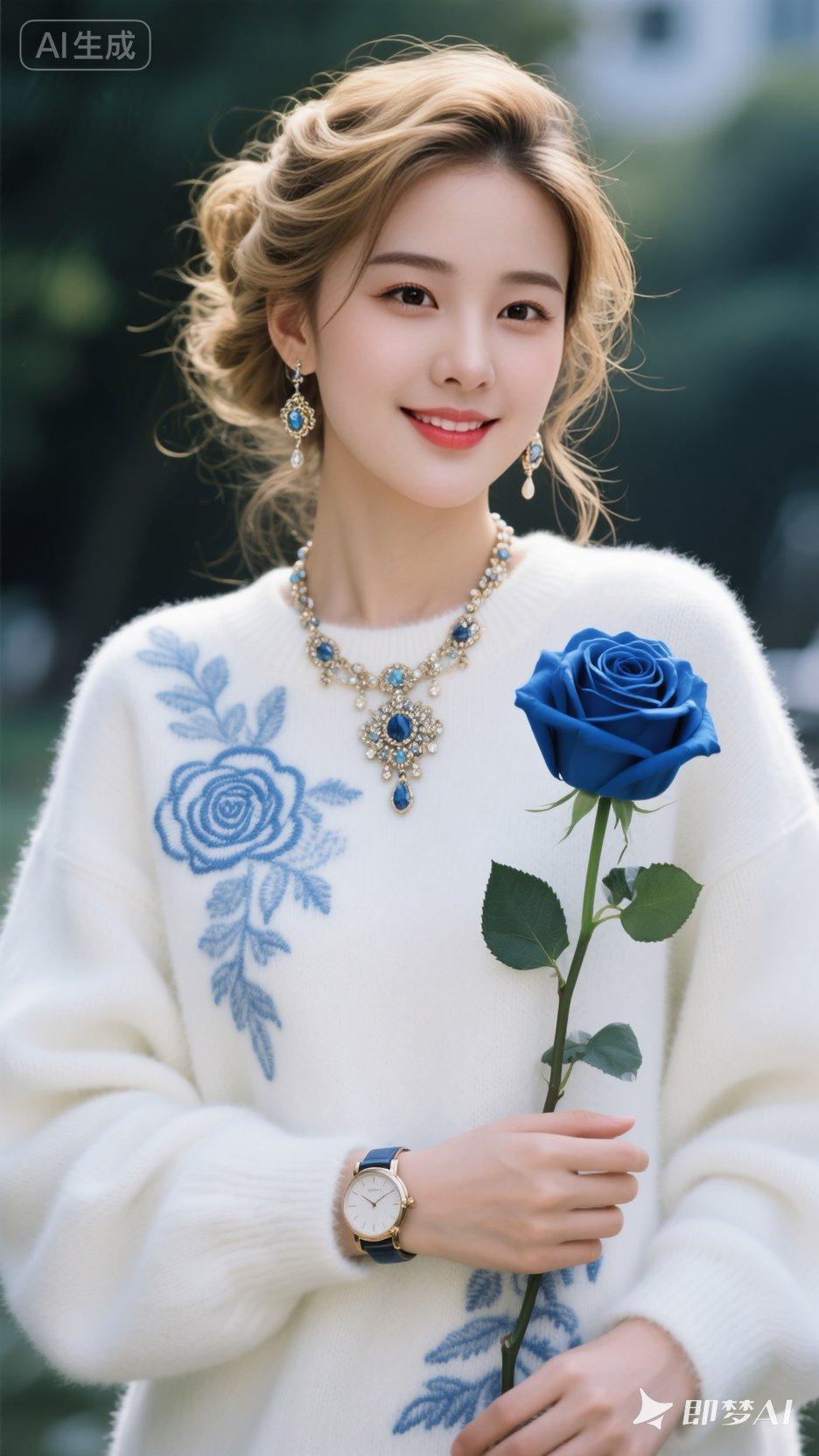 一位符合东方美学的20岁女神形象,她身着白色宽松大码羊绒套头衫有蓝色制绣,精致妆容,玫瑰金色头发