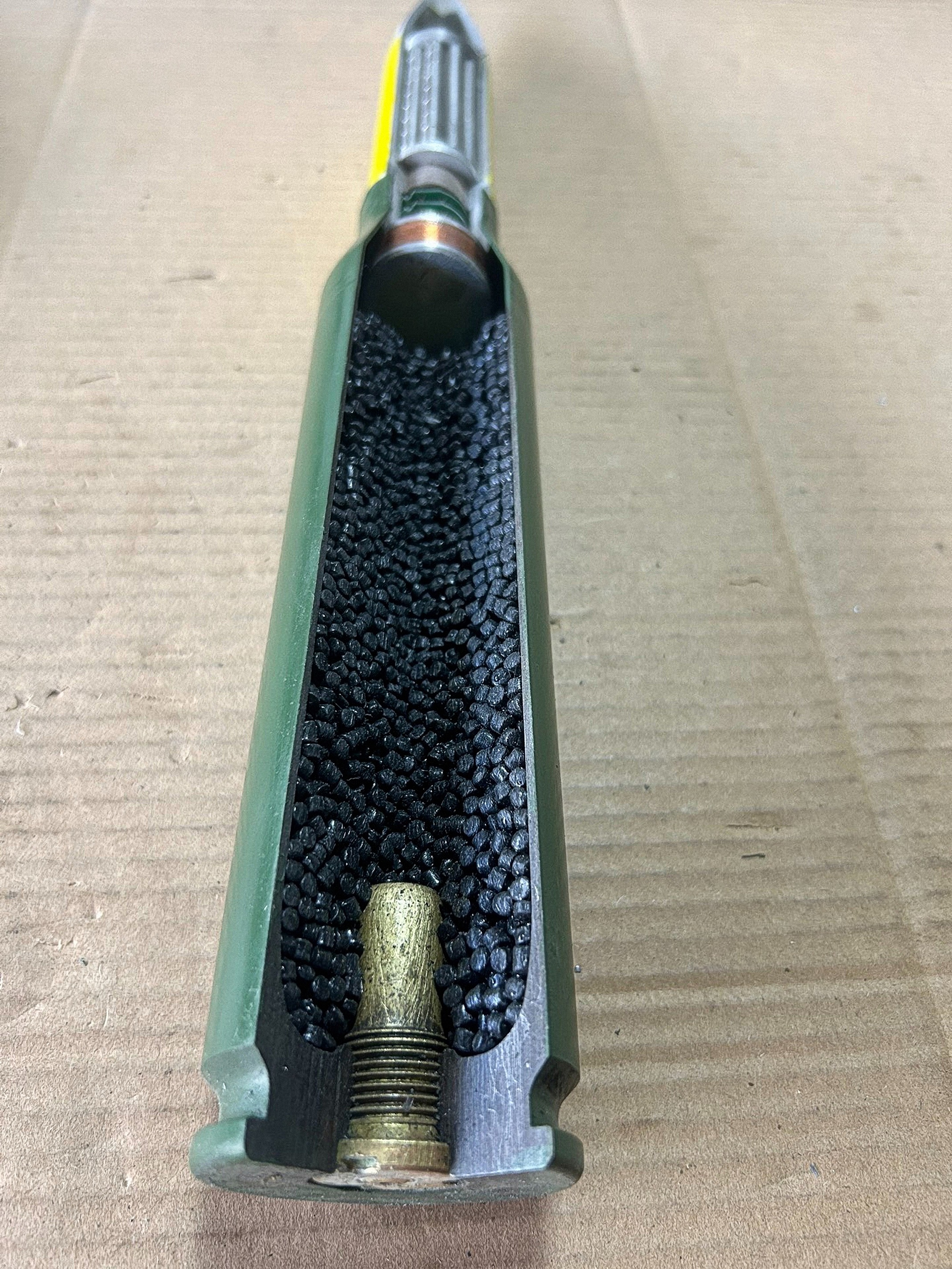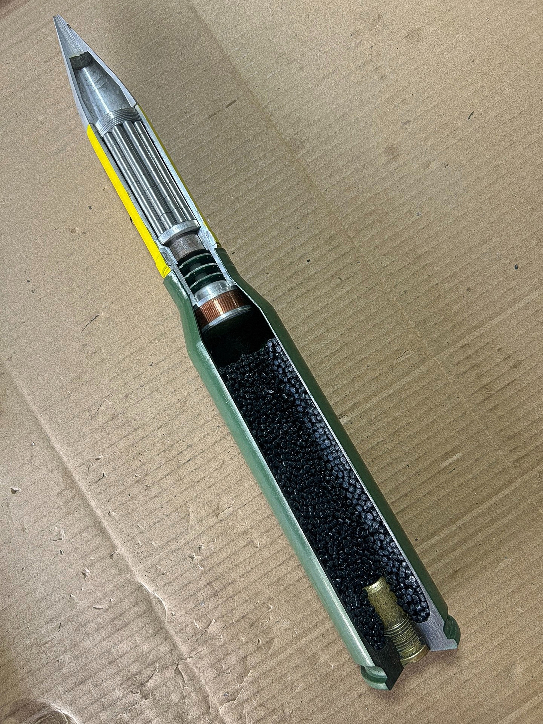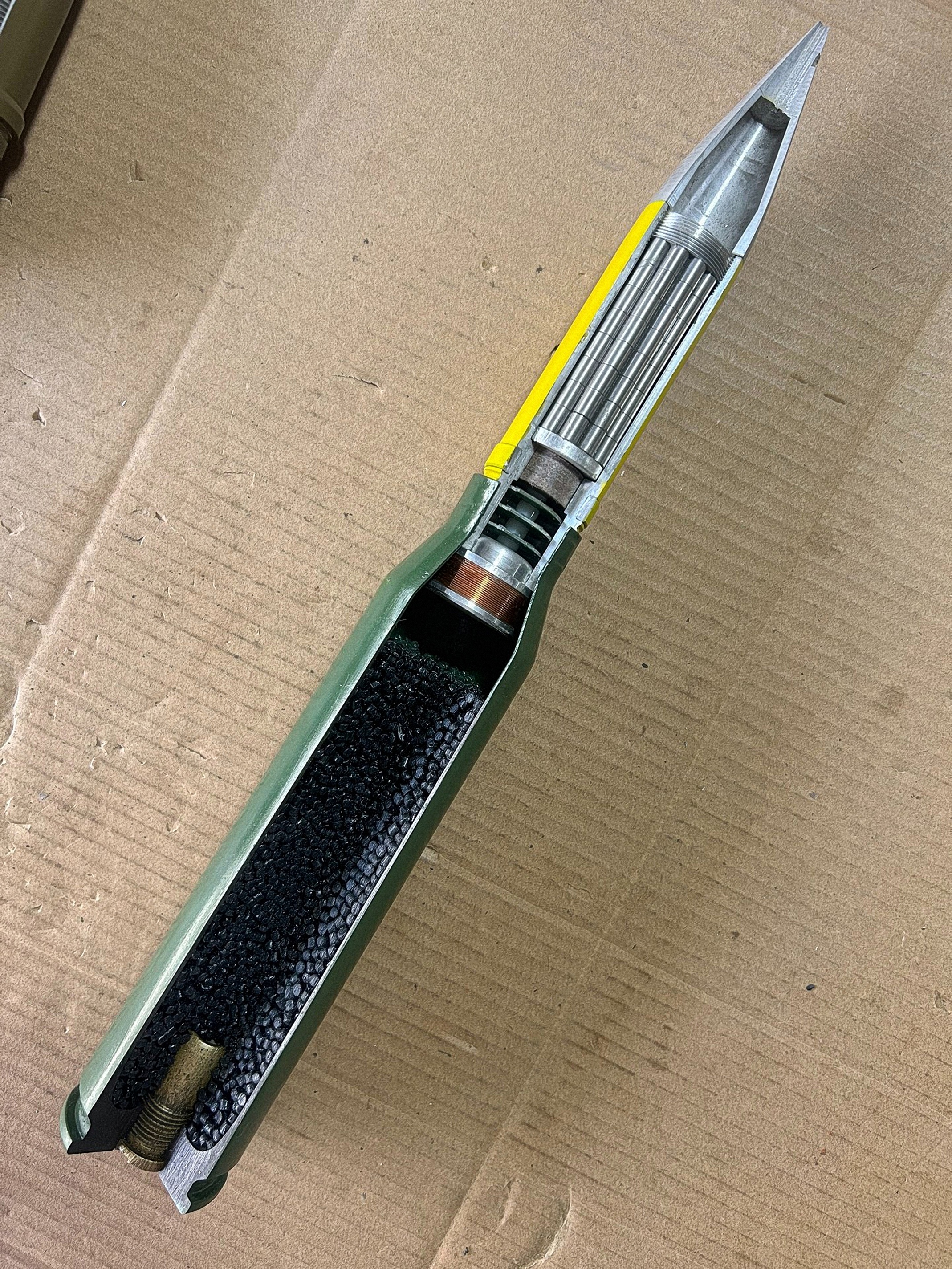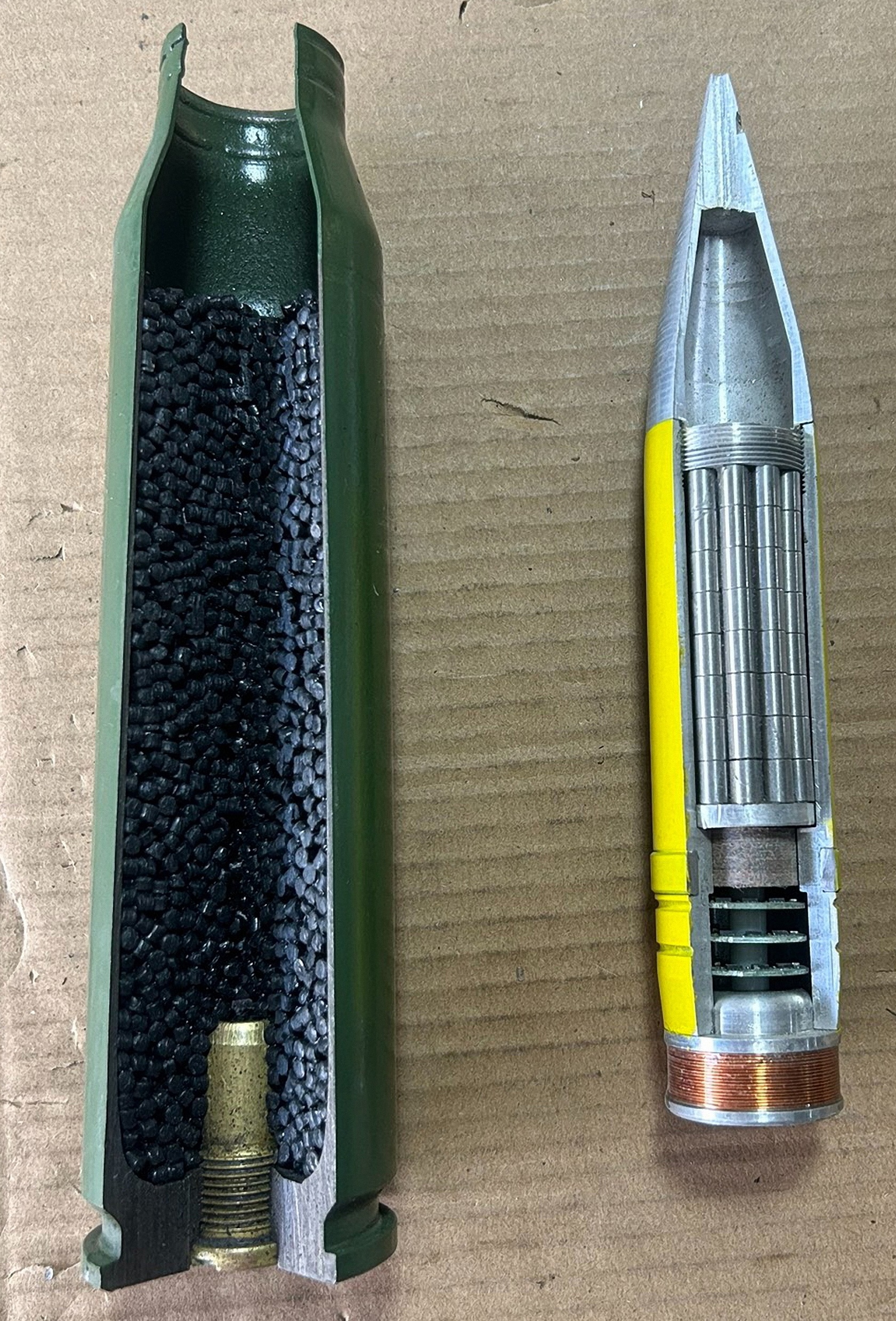来自老哥的图,国产双35的阿海德弹,国内称为多束弹,由于需要炮口编程线圈才能使用,因此牵引炮PG99不能打,PGZ09才能打