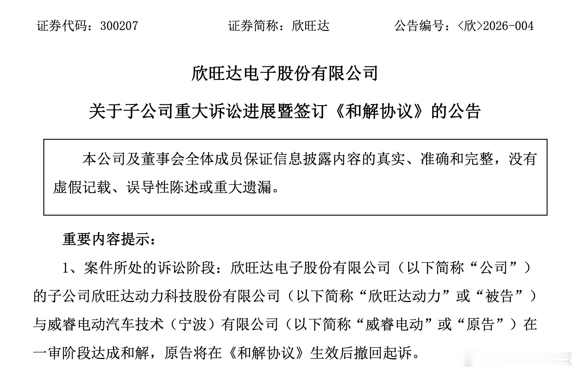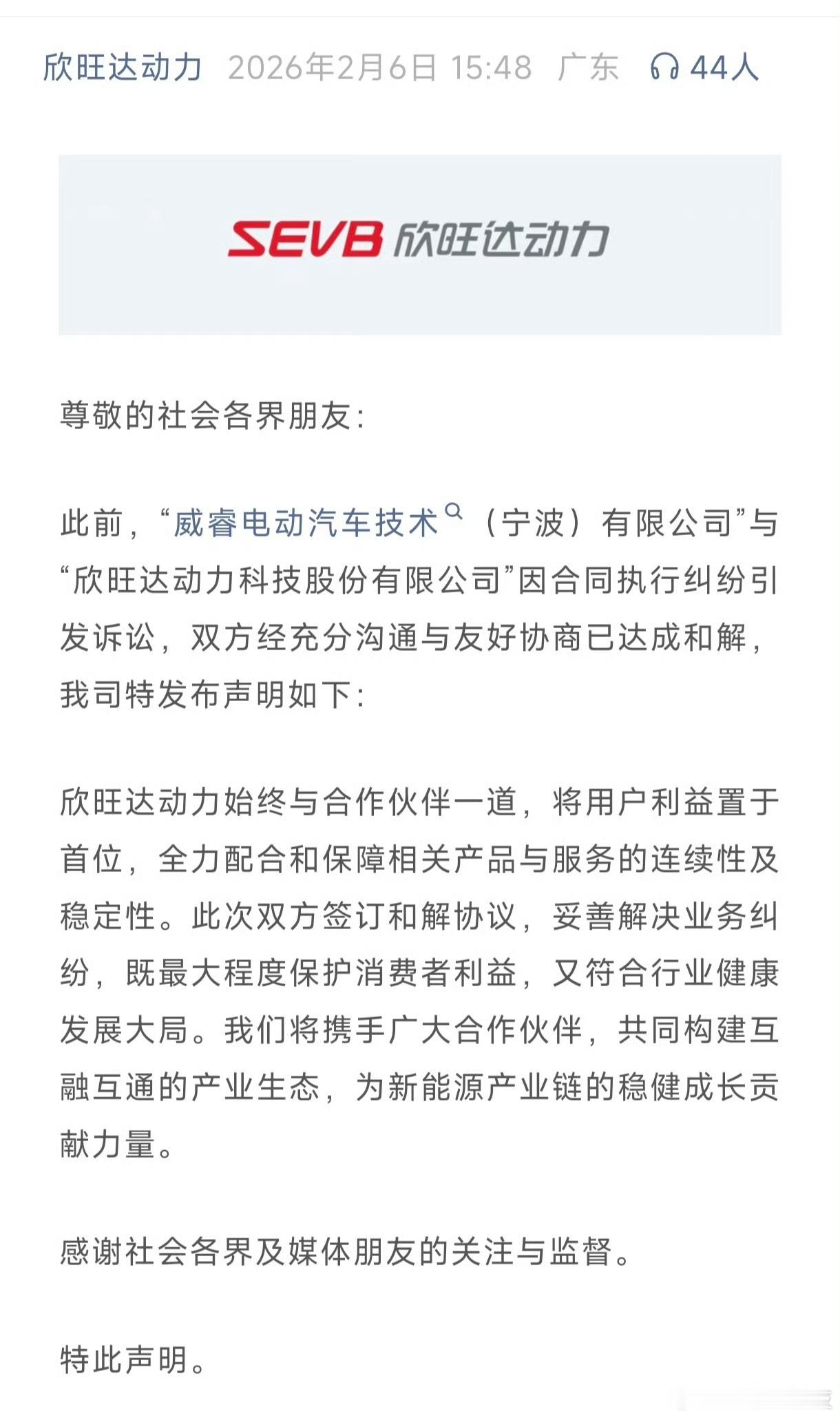 2026年2月6日,欣旺达方面发布公告称,双方经过充分沟通已经达成和解。根据《和解协议》,欣旺达动力需向威睿电动支付6.08亿元,该金额为扣除已承担费用后的剩余赔偿款,分五年结清。