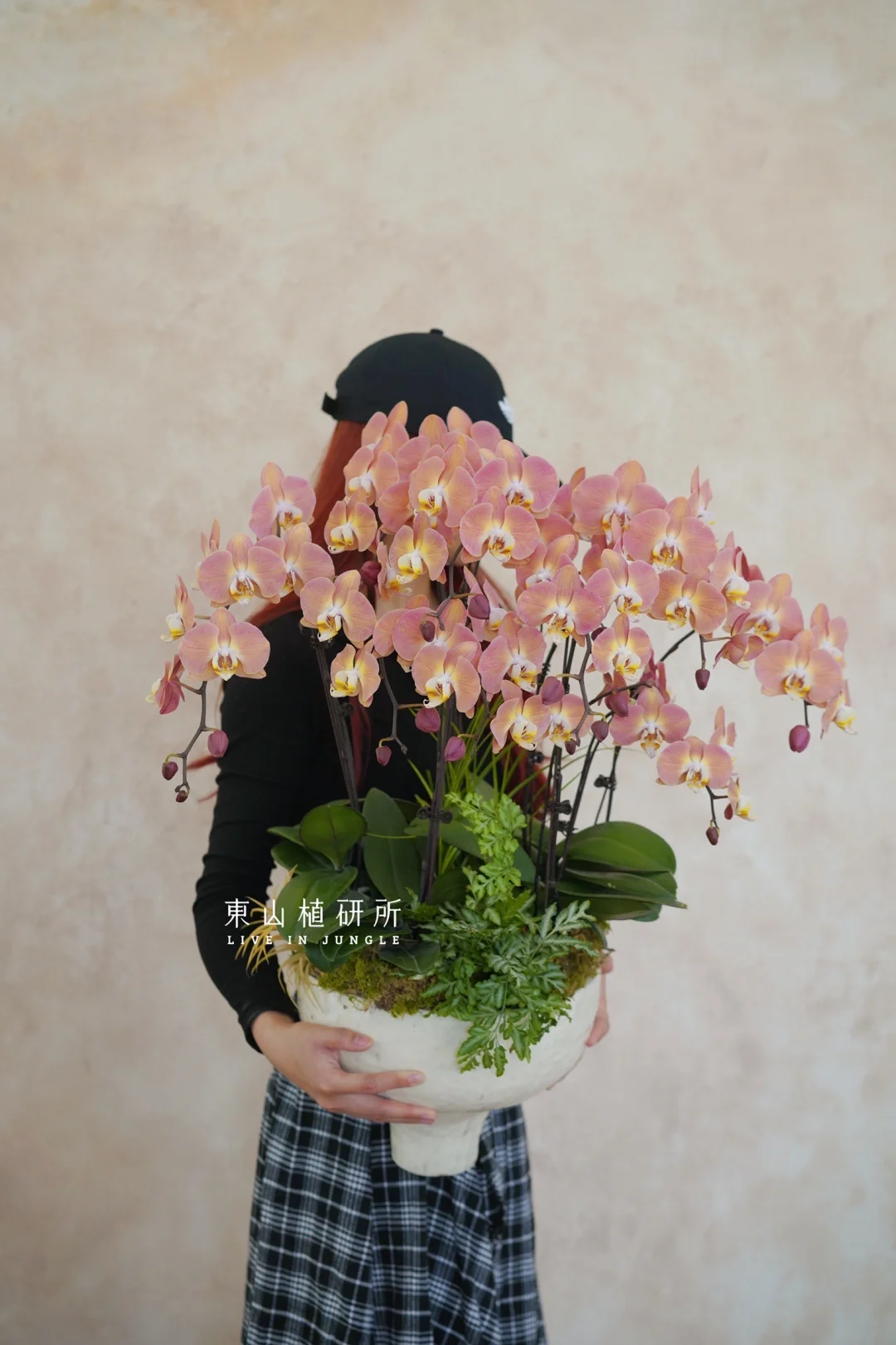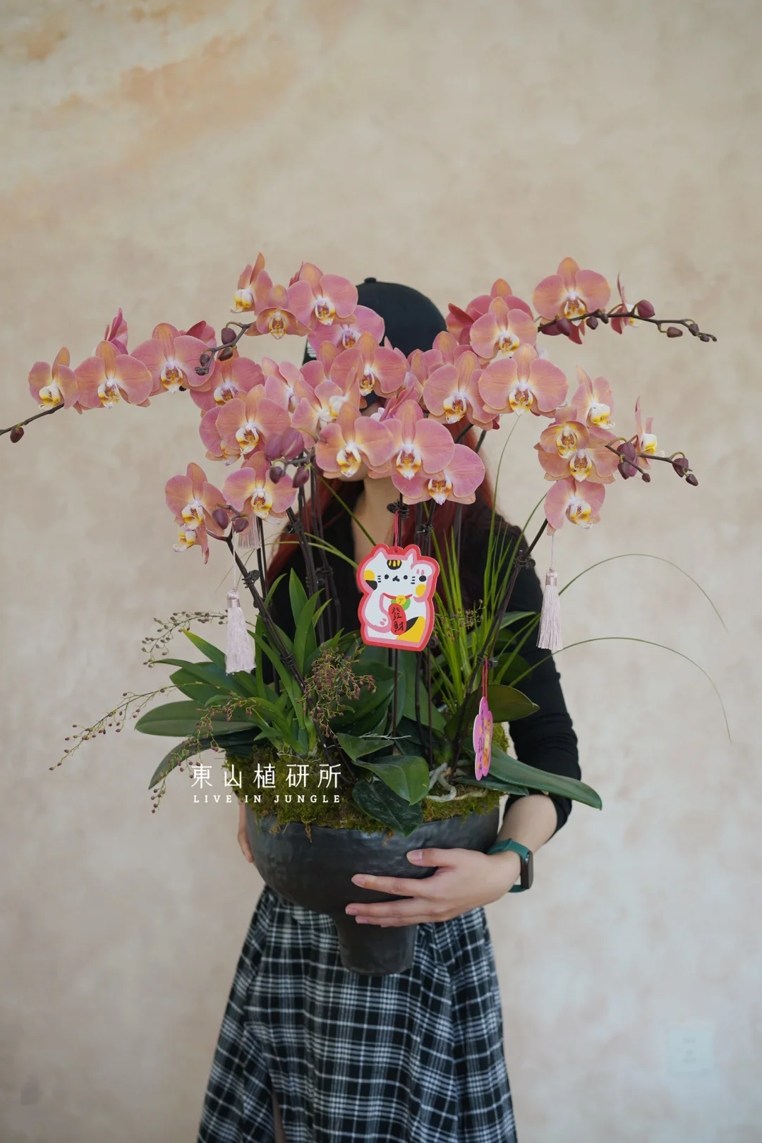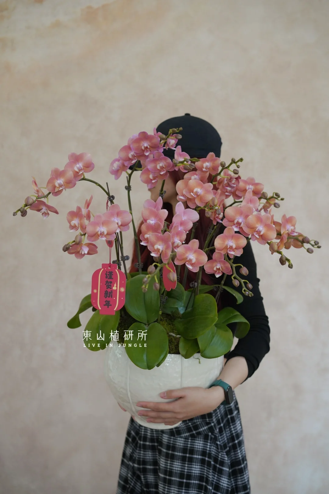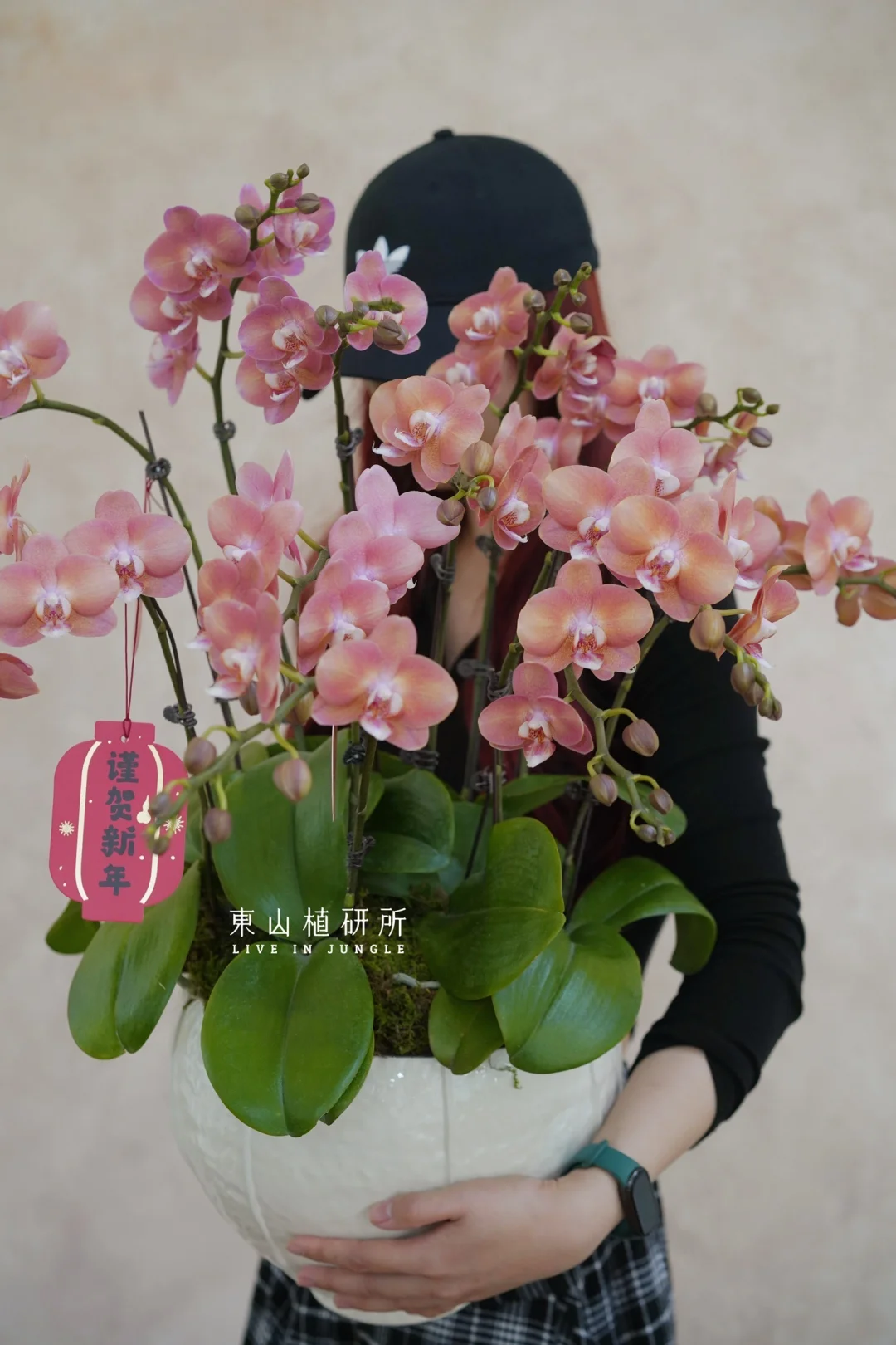 复古橘粉色蝴蝶兰 花瓣饱满、花量密集,是年宵花的热门选择 自带温柔的滤镜 搭配米白色陶盆的柔和轻盈, 哑光黑深盆沉稳大气 根据需要可以适配不同空间风格 ———