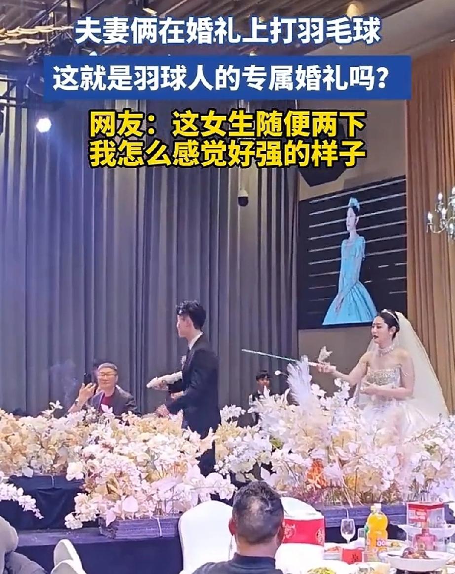 2月7日,安徽一对新婚夫妻举办了一场别开生面的婚礼,独具特色。使这场婚礼更具纪念意义。 这对新人有着共同的爱好,喜欢羽毛球运动。同样的爱好,让彼此相识,在切磋技艺时,增进了友谊。进一步发展,碰撞出爱情的火花,最终走进了婚姻的殿堂。 在婚礼现场,新婚夫妻俩人在云集的嘉宾面前,表演打羽毛球。以此感谢红娘羽毛球。 爱情是心心相印,羽毛球让两人的心联在一起。今后的生活,也将有共同的爱好而更加甜蜜。 夫妻俩在婚礼上打羽毛球婚礼现场