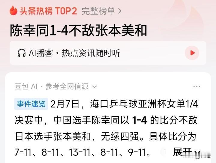 海口乒乓球亚洲杯女单1/4决赛,陈幸同1-4不敌张本美和。 比分7-11、8-11、13-11、8-11、9-11。看到这比分,不得不说日本乒乓球能和中国乒乓球掰掰手腕,出了中国估计就是日本厉害了。 希望其他选手能力挽狂澜取得好成绩,个人认为中国乒乓球输一输这样还好一点,其他国家才有积极性,不然老是中国拿冠军,其他国家没什么动力。 对此你们怎么看呢?