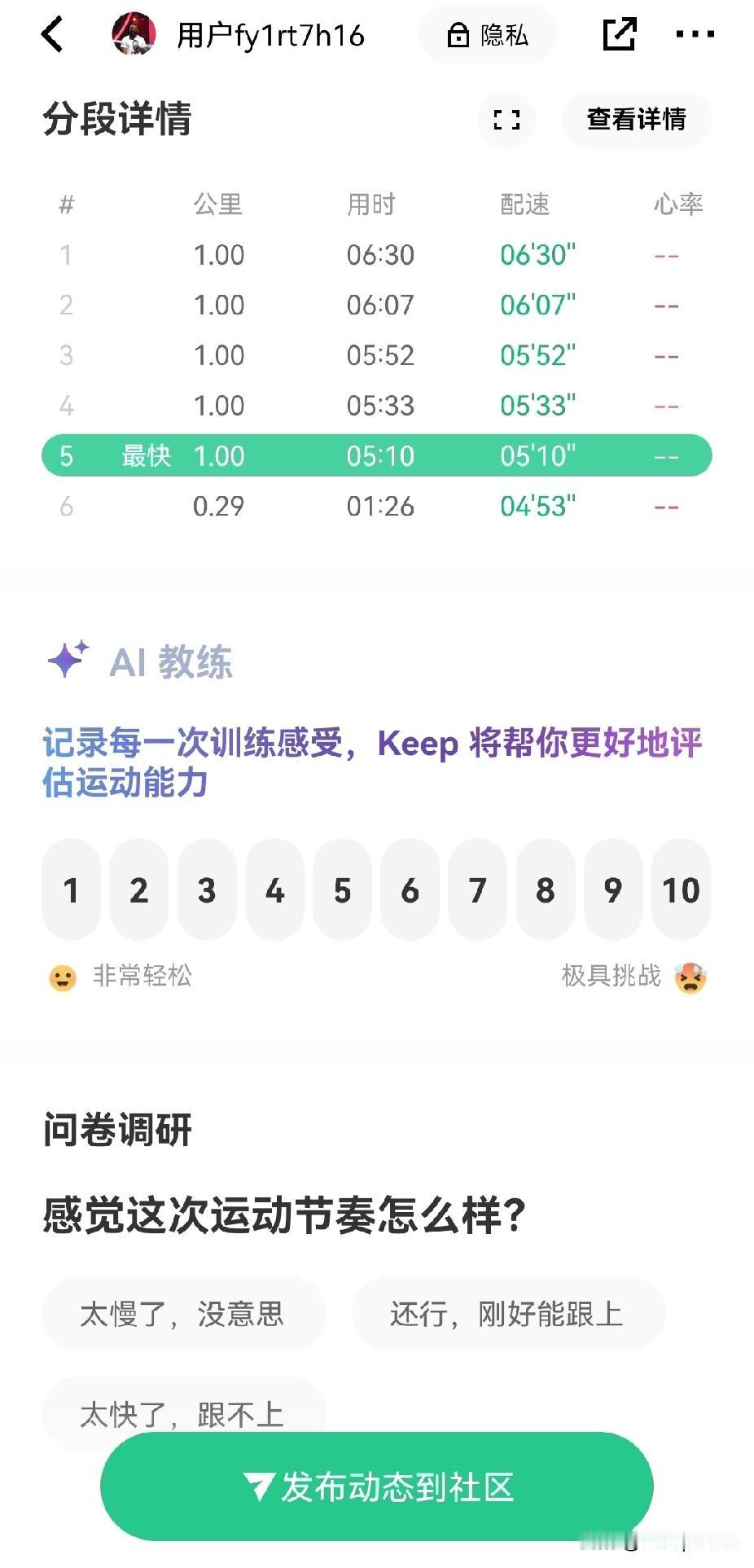 6分配速,在跑步圈算什么水平?连续两天因为应酬没有跑步了,今天还是过来打卡一下!今天由于降温,来操场锻炼的人少之又少,不过还是见到了一个熟悉的身影,就是每天都能看到的一位大哥!之前对他有所了解,他差不多55岁,坚持跑步20多年,跑一休一,一天能跑15-25公里,而且生活极度自律,不抽烟不喝酒,说实话蛮佩服他的! 喝完酒跑步能力明显下降了,刚跑了不到5圈,就感觉有点累,而且全身还是有些冰凉,没有进入状态,一下子就被大哥套了一圈,虽然我没有刻意追求配速,但是被套圈还是让我有些尴尬,跑到3公里多,我看到他又追到身后了,我想着为了“尊严”而战,必须冲刺一波,后面的配速才有所提高! 当然,跑步都初衷并不是追求配速,只不过和正能量的人一起跑真的会进步,可能生活也是如此,每天进步一点点,日积月累后,你将“杀死”坠落的自己!加油!晨跑配速