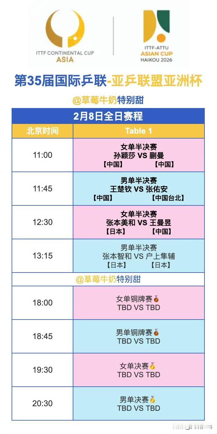 2月8日全日赛程 11:00 T1 女单半决赛 孙颖莎🇨🇳VS蒯曼🇨🇳 11:45 T1 男单半决赛 王楚钦🇨🇳VS张佑安(中国台北) 12:30 T1 女单半决赛 王曼昱🇨🇳VS张本美和🇯🇵 13:15 T1 男单半决赛 张本智和🇯🇵VS户上隼辅🇯🇵 18:00开始,将进行女单、男单铜牌赛&女单、男单决赛