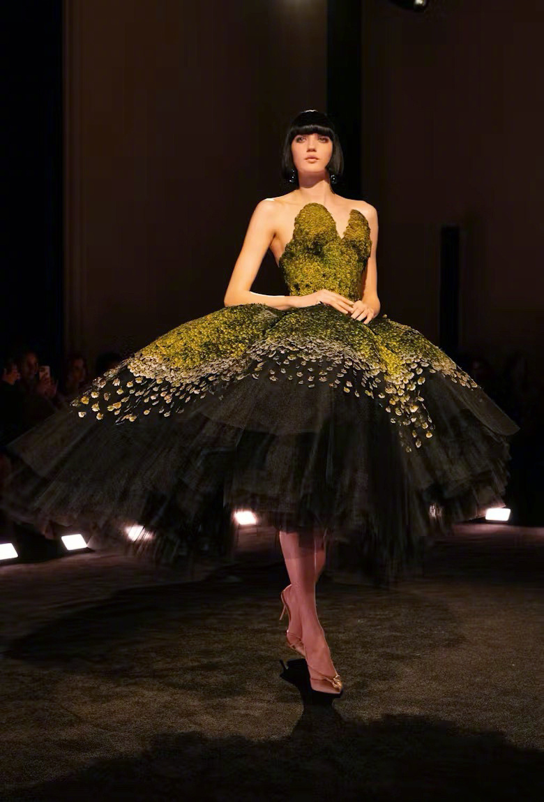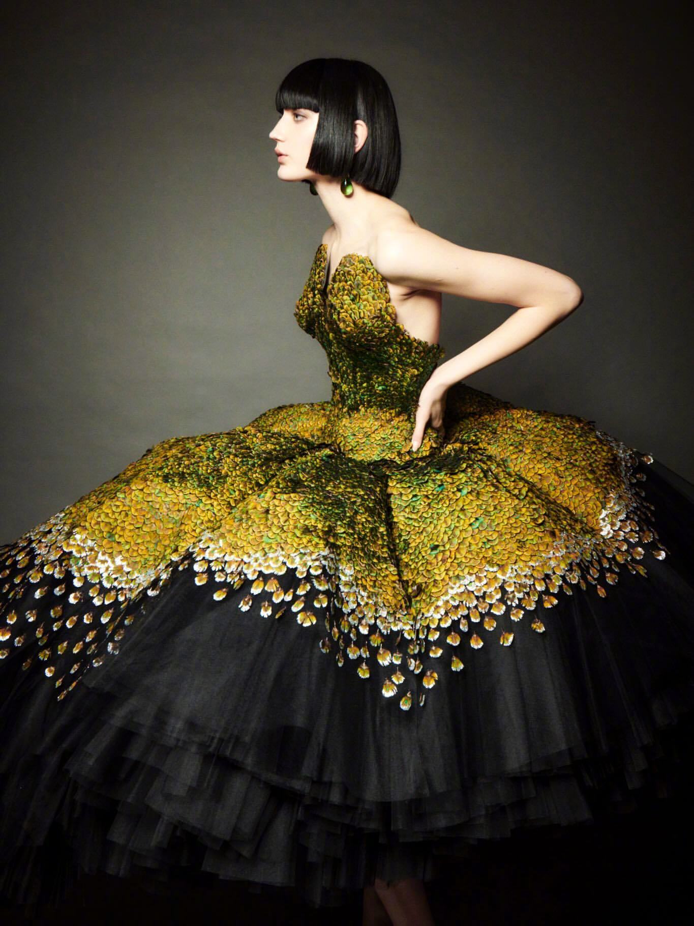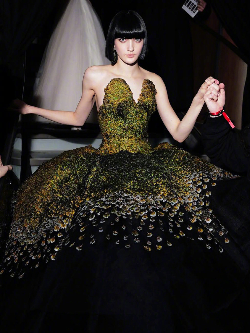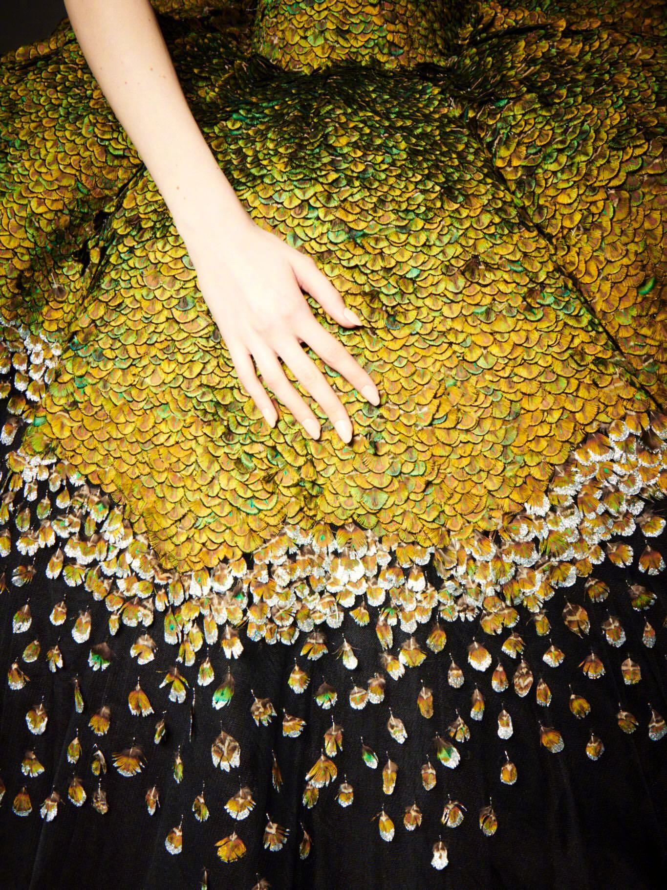 这条“孔雀裙” 以13,800片真丝羽片精制而成,呈现28种层次色调。领口以孔雀羽饰刺绣塑形,经艾蒿绿水晶虹彩浸染,流光隐现;裙撑之下,黑色薄纱叠层构筑丰盈立体廓形。搭配手工雕刻鸟首造型耳环,鸟喙衔绿色树脂垂饰,增添细节张力。