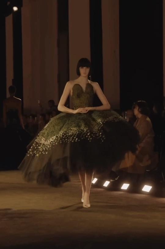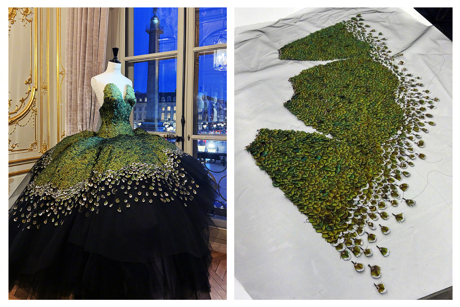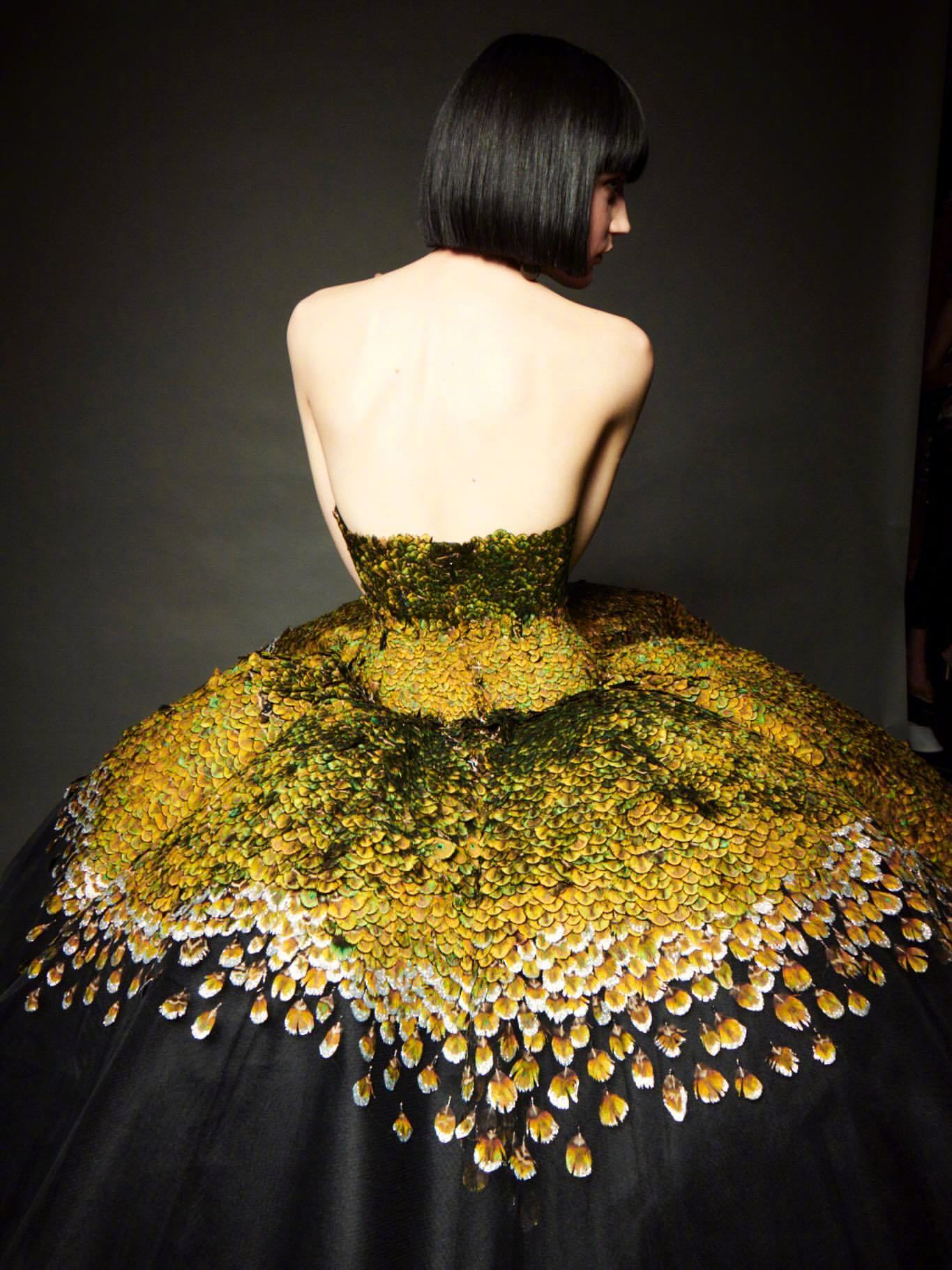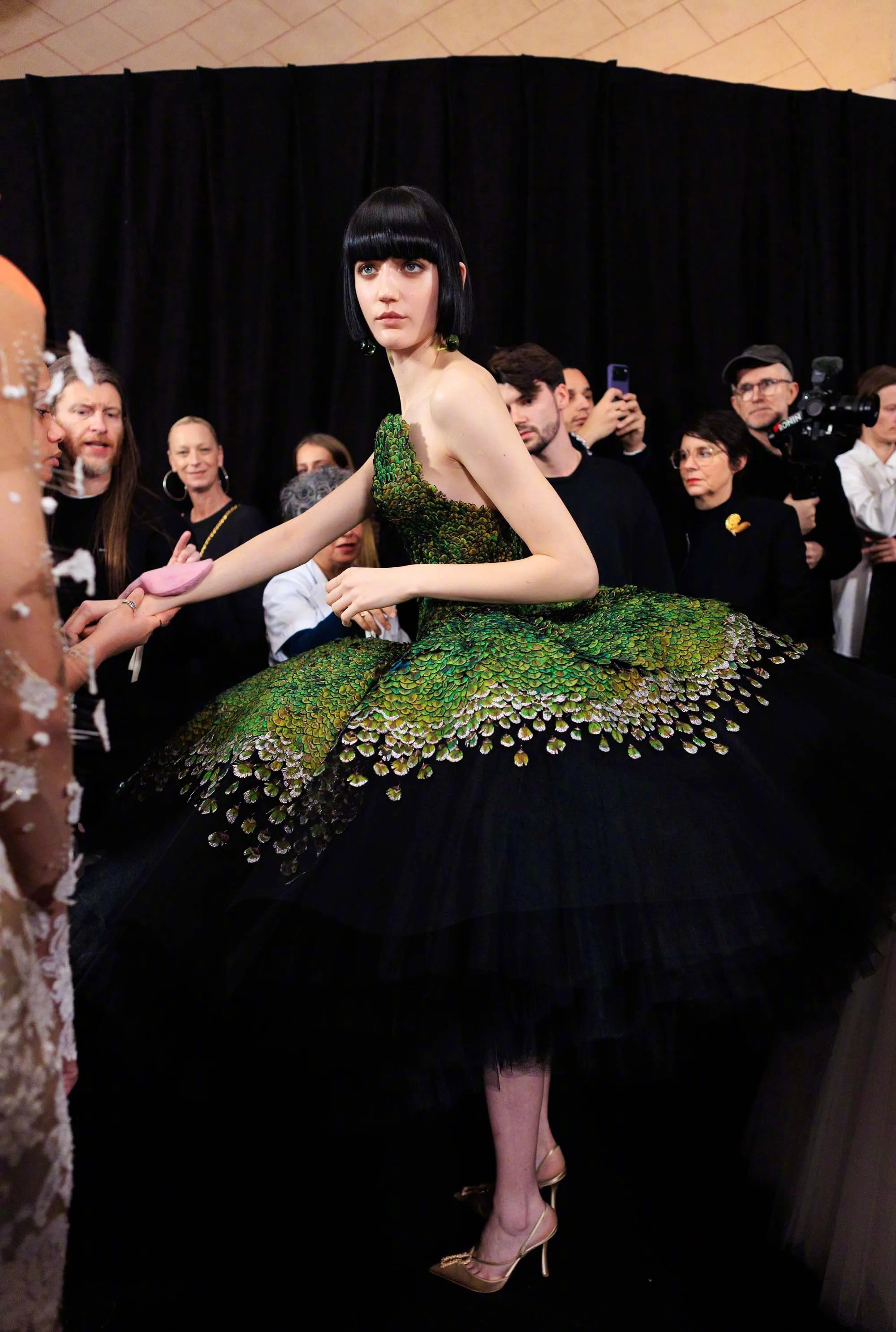这条“孔雀裙” 以13,800片真丝羽片精制而成,呈现28种层次色调。领口以孔雀羽饰刺绣塑形,经艾蒿绿水晶虹彩浸染,流光隐现;裙撑之下,黑色薄纱叠层构筑丰盈立体廓形。搭配手工雕刻鸟首造型耳环,鸟喙衔绿色树脂垂饰,增添细节张力。