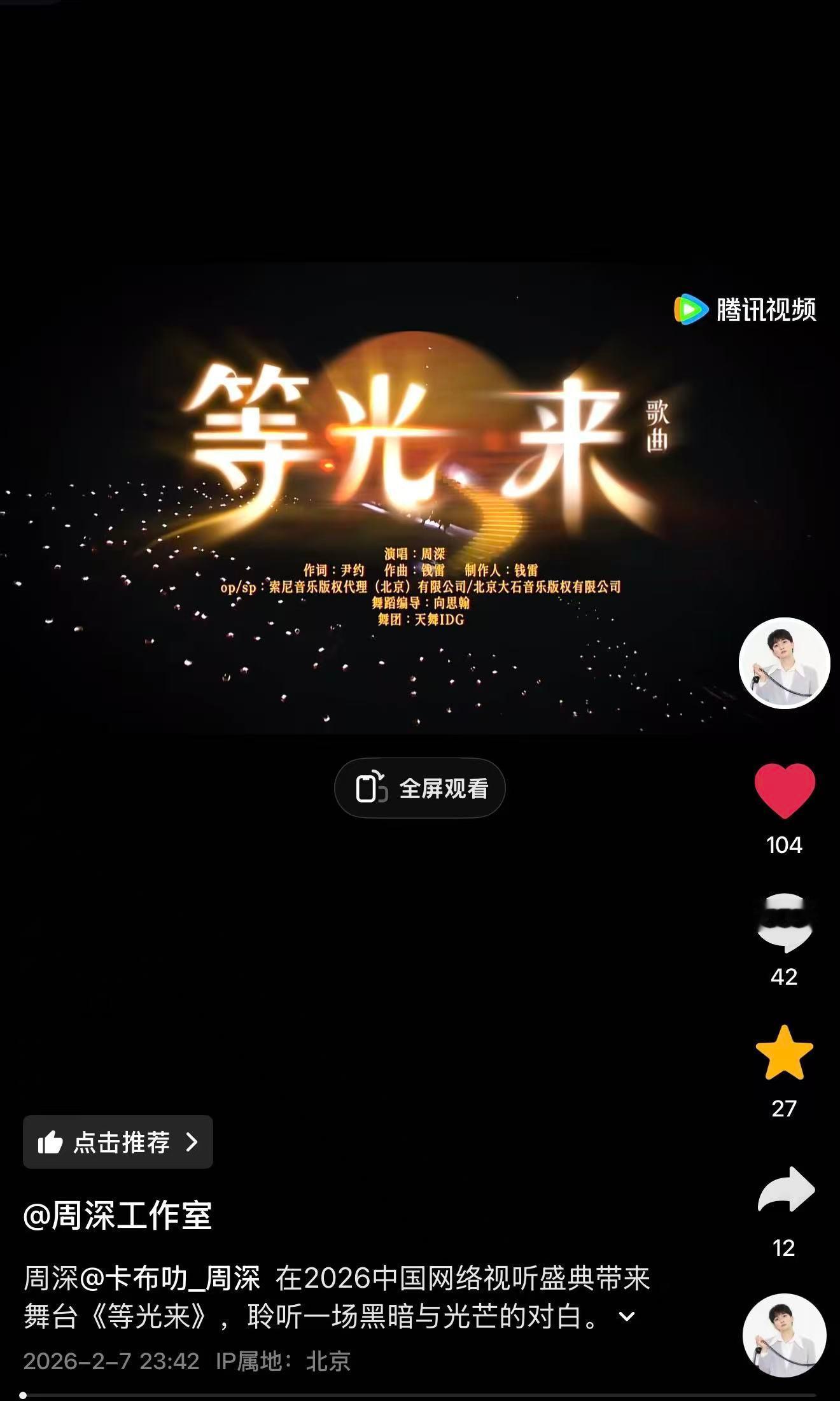 周深📣2.7柿子更新📣【周深工作室】多平台更新深深今晚《等光来》