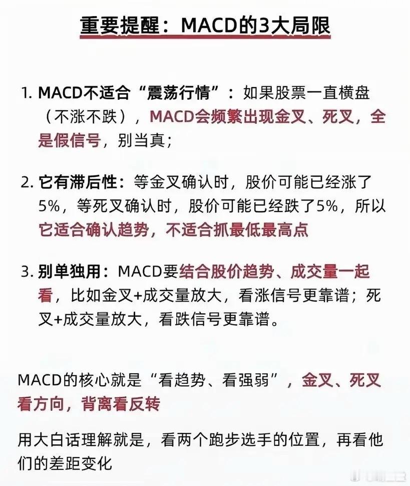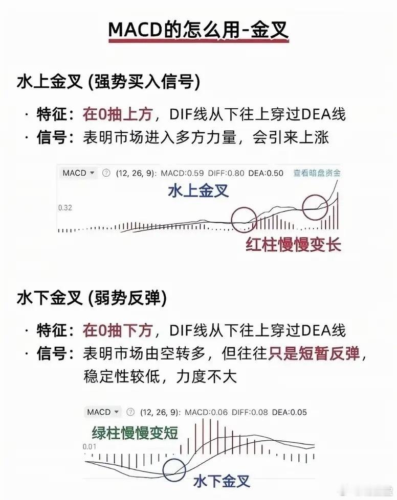 用好MACD:在概率博弈中建立交易纪律在A股市场的技术分析工具中,MACD无疑是普及率最高的指标之一,其背后是市场参与者对趋势性机会的共同认知。技术面分析的核心是捕捉大概率事件,而非追求绝对精准,MACD正是通过“金叉/死叉看方向、背离看反转”的逻辑,为交易者提供买卖决策的参考依据,投资有风险,入市需谨慎。金叉作为最基础的信号,需区分“水上”与“水下”。水上金叉发生在0轴上方,代表多方主导的强势上涨信号,配合红柱持续放大,是加仓或持股的明确信号;而水下金叉仅为空转多的弱势反弹,往往力度有限,适合短线快进快出。顶背离与底背离则是判断趋势反转的关键:股价创新高但MACD高点回落,顶背离预示上涨动能衰竭,是减仓或止盈的信号;若股价创新低但MACD低点抬升,底背离则暗示下跌力度减弱,可考虑分批布局。但MACD并非万能,其在震荡行情中会频繁出现假信号,且天生的滞后性难以精准捕捉高低点。因此,单独依赖MACD风险较高,需结合股价趋势、成交量等指标综合判断,比如金叉配合放量上涨,信号可靠性将大幅提升。对普通投资者而言,更重要的是建立严格的交易体系,用MACD辅助判断做T、加仓或减仓的时机,而非单纯依赖信号冲动交易。技术指标的价值,最终体现在纪律性的执行中,唯有如此,才能在概率博弈中积累长期收益。投资有风险,入市需谨慎。