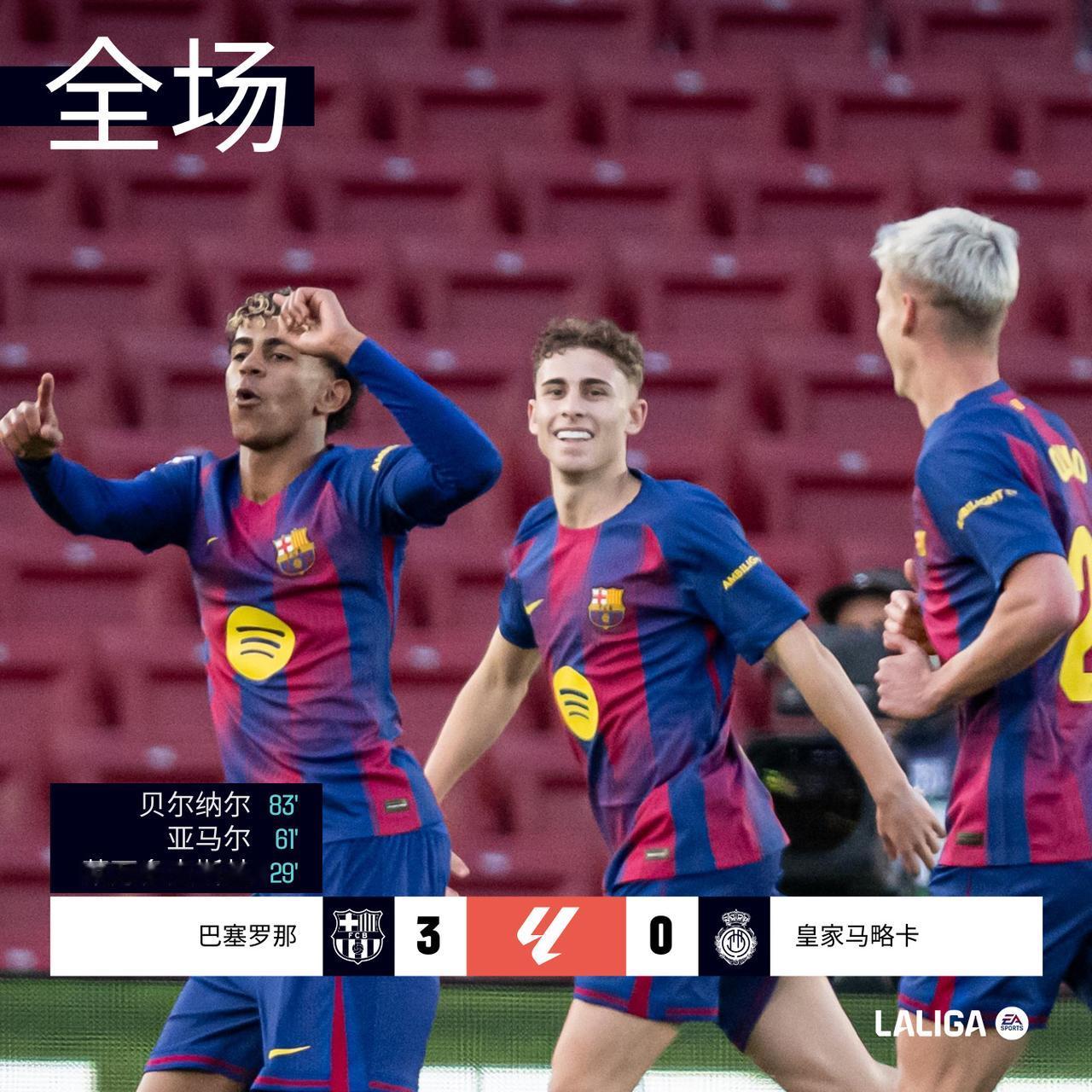 全场|@巴塞罗那足球俱乐部 3-0 皇家马略卡 26' 拉什福德远射稍偏。 ⚽️29' 莱万多夫斯基门前晃过防守队员将球打进,1-0。 ⚽️45+2' 亚马尔门前险些将球打进扩大比分。 ⚽️61' 亚马尔攻入世界波,2-0。 ⚽️83' 费尔明助攻贝尔纳尔将比分锁定为3-0。 巴萨主场完胜获得3分。