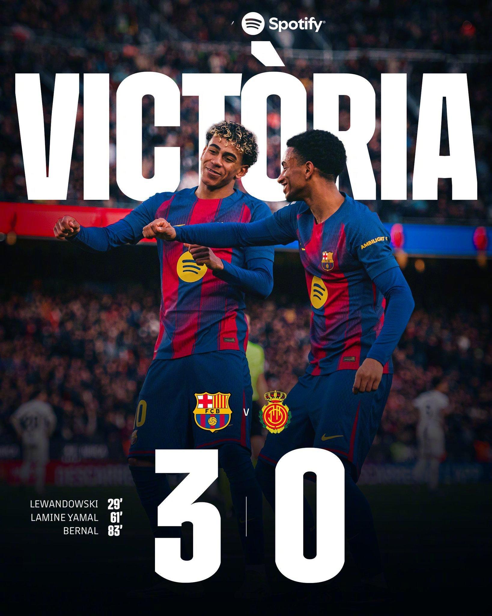 巴萨vs马略卡 全场比赛结束,巴萨主场 3:0 完胜马略卡。本场比赛红蓝军团牢牢掌控比赛节奏与球权。上半场,拉什福德多次在左路远射制造威胁,第29分钟,他的射门造成禁区内混乱,莱万机敏补射破门,为巴萨首开纪录。易边再战,巴萨明显提升进攻强度与节奏。第61分钟,亚马尔打入一记技惊四座的世界波,将比分扩大。此后巴萨持续施压,第82分钟,费尔明送出助攻,替补登场的贝尔纳尔在一次快速反击中帮助巴萨再下一城。最终,红蓝军团在主场稳稳收获三分。欢迎大家在评论区分享你对本场比赛的看法!